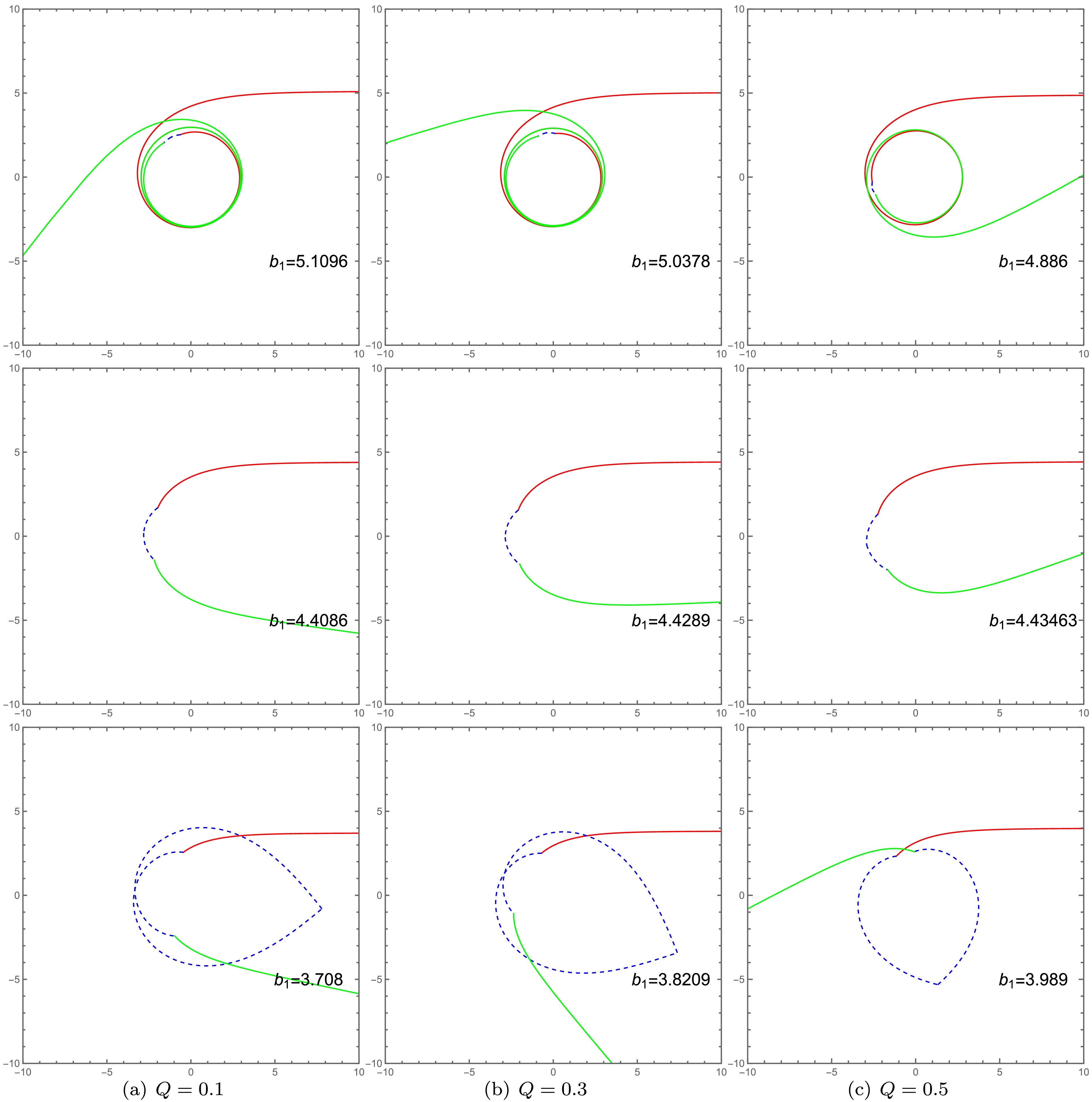 $ \left(r_1, \varphi\right) $ , specifically for impact parameters in the range$ Zb_{c_2}<b_1<b_{c_1} $ . The first, second, and third rows correspond to the cases of$ Q = 0.1 $ ,$ Q = 0.3 $ , and$ Q = 0.5 $ , respectively. The trajectories are denoted as follows: red lines represent incident photons in spacetime$ M_1 $ , green lines represent outgoing photons in spacetime$ M_1 $ , and blue dashed lines depict the photon trajectories within spacetime$ M_2 $ . The parameters are fixed at$ l = 0.01 $ ,$ R = 2.6 $ ,$ M_2=1 $ , and$ M_2=1.2 $ .
