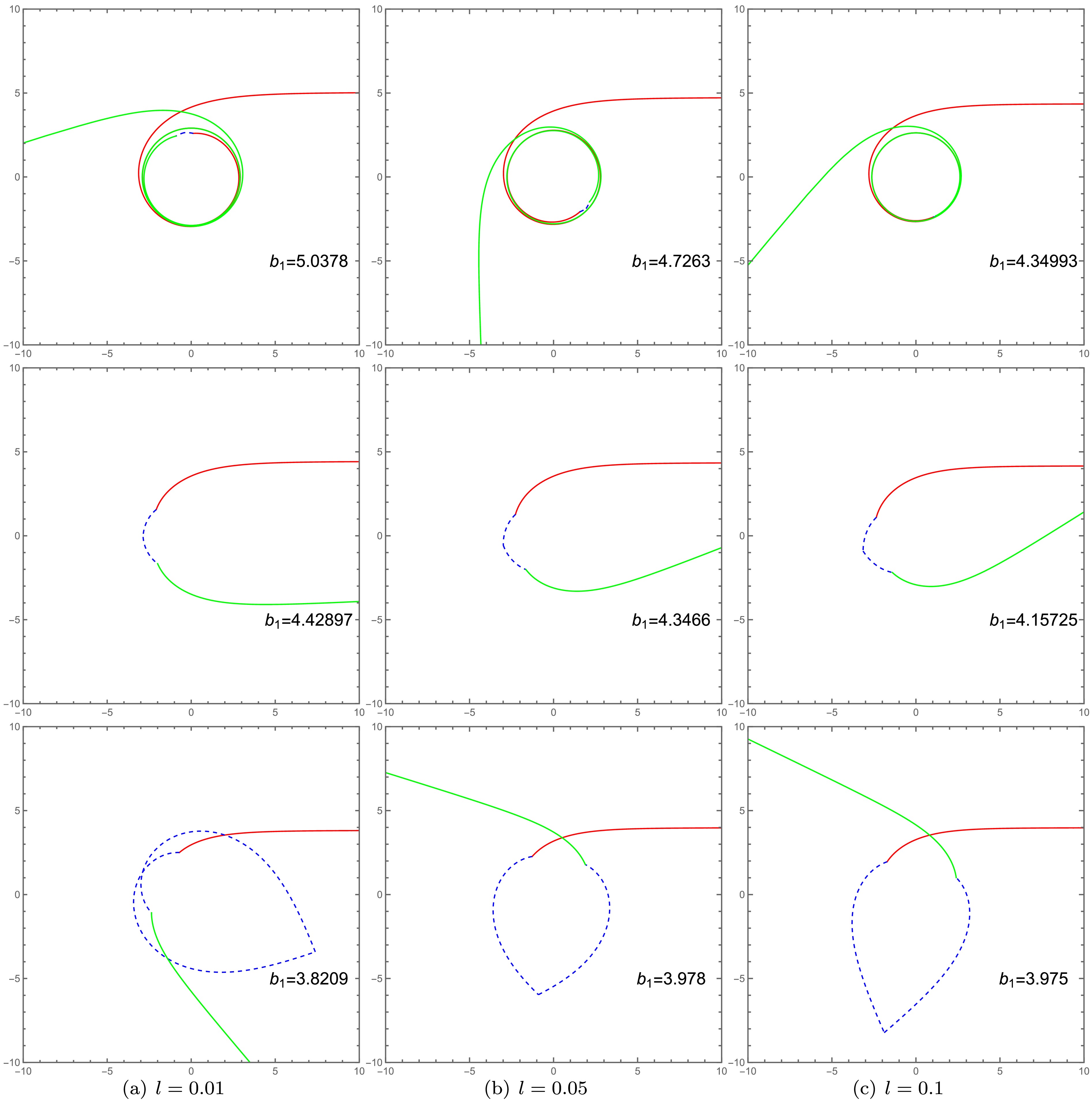 $ \left(r_1, \varphi\right) $ , this figure illustrates the dependence of photon trajectories in spacetime$ M_i $ on the Lorentz-violation parameter l for impact parameters in the range$ Zb_{c_2}<b_1<b_{c_1} $ . The first, second, and third rows correspond to$ l=0.01 $ ,$ l=0.05 $ , and$ l=0.1 $ , respectively. Red curves represent incident photons in spacetime$ M_1 $ , green curves represent outgoing photons in spacetime$ M_1 $ , and blue dashed curves depict trajectories within spacetime$ M_2 $ . The parameters are fixed at$ Q=0.3 $ ,$ R =2.6 $ ,$ M_1= 1 $ , and$ M_2 = 1.2 $ . -
