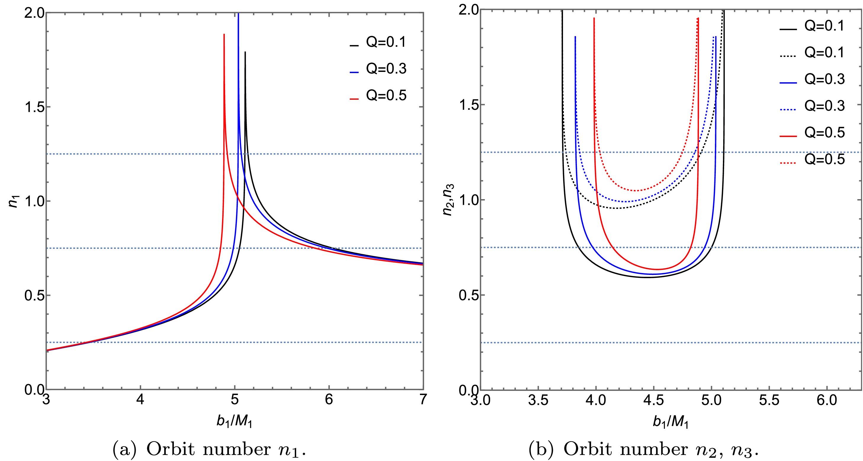 $ b_1 $ around an ATSW (with$ l = 0.01 $ ) in a KR field. The left panel displays the trajectory count$ n_1 $ , while the right panel shows the counts for$ n_2 $ (solid lines) and$ n_3 $ (dashed lines). The results for different charge values are compared:$ Q = 0.1 $ (black lines),$ Q = 0.3 $ (blue lines), and$ Q = 0.5 $ (red lines). The parameters are fixed at$ R = 2.6 $ ,$ M_1 = 1 $ , and$ M_2 = 1.2 $ .