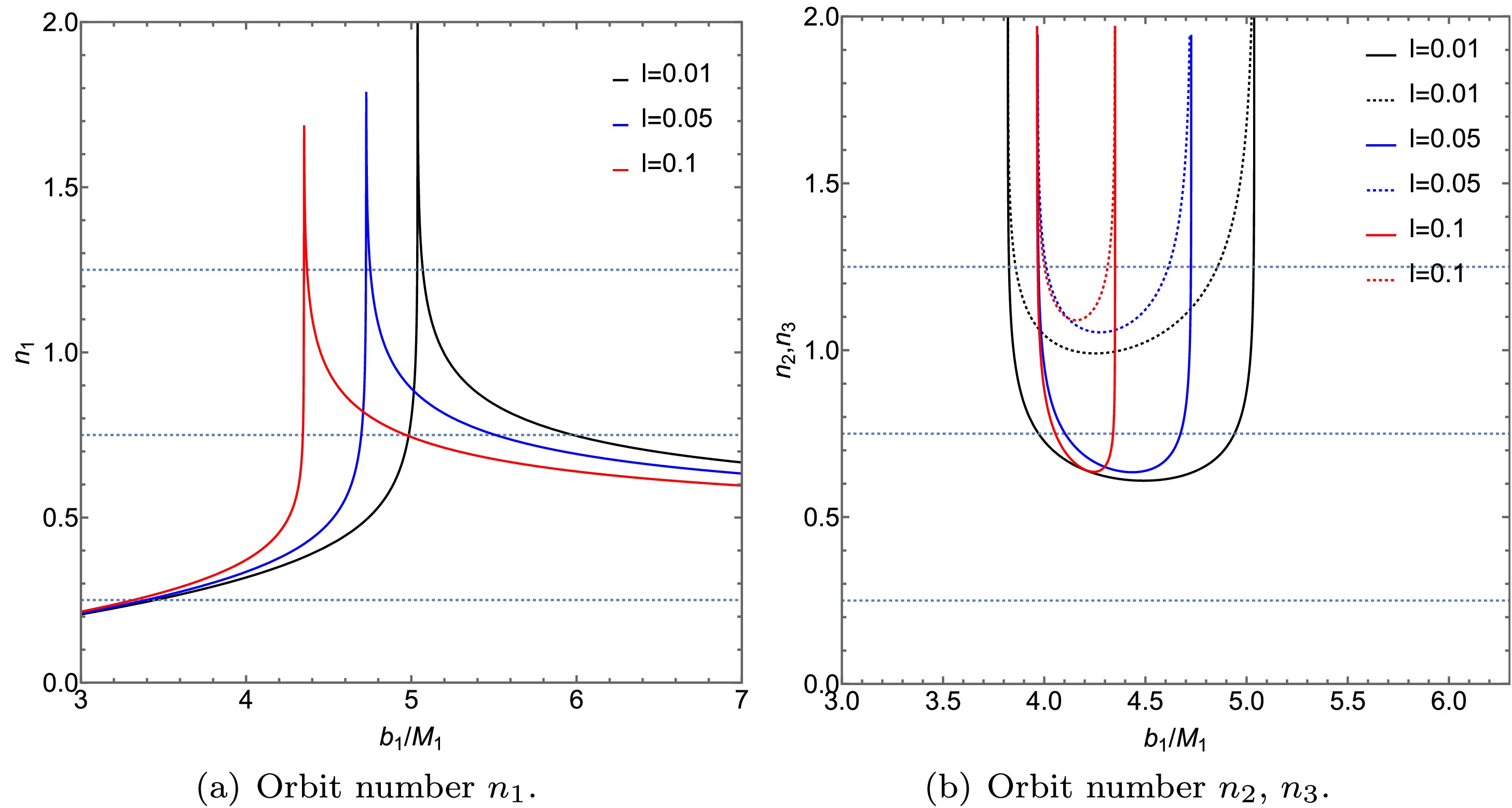 $ b_1 $ around the ATSW (with$ Q=0.3 $ ). The left figure shows the trajectory count for$ n_1 $ , while the right figure illustrates the trajectory counts for$ n_2 $ (solid lines) and$ n_3 $ (dashed lines). We analyze the trajectory counts for photons under different Lorentz-violation parameters l:$ l=0.01 $ (black lines),$ l=0.05 $ (blue lines), and$ l=0.1 $ (red lines). The parameters are set as$ R=2.6 $ ,$ M_1 = 1 $ , and$ M_2 = 1.2 $ .Figs. 7 and 8 illustrate the relationship between the number of photon trajectories and the impact parameter