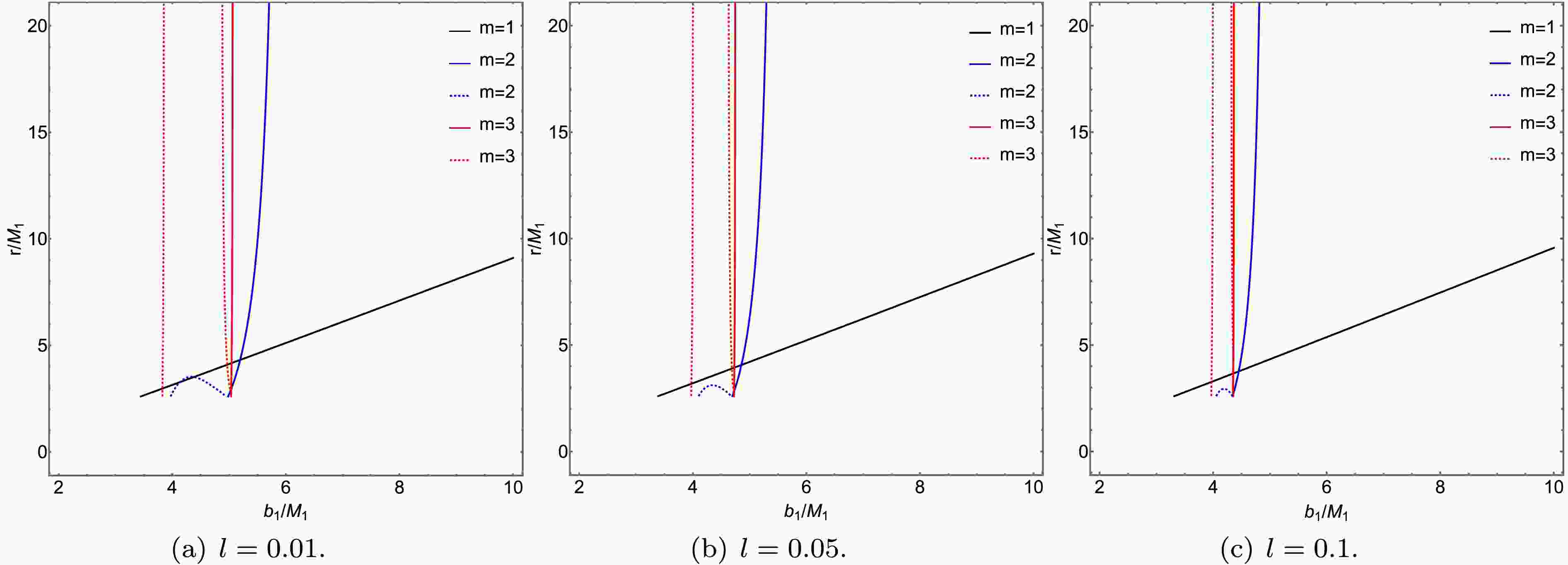 Figs. 9 and 10 show the relationship between the transfer function and the impact parameter $ b_1 $ under the influence of the charge Q and the Lorentz-violation parameter l. The selected values for Q are 0.1, 0.3, and 0.5, while for l they are 0.01, 0.05, and 0.1. From Figs. 9 and 10, it can be observed that the first transfer function ($ m=1 $), represented by the black solid line, corresponds to the direct image of the accretion disk. Due to its relatively small slope-where $ {\rm{d}} r (b_1) / {\rm{d}} b_1 $ is defined as the demagnification factor, the small demagnification leads to the observed intensity being dominated by the direct image. The second transfer function ($ m=2 $), shown as the blue solid line, exhibits a larger demagnification factor, forming a demagnified lensing ring from the back side of the thin accretion disk and contributing only marginally to the observed intensity. The third transfer function ($ m=3 $), represented by the red solid line, displays the largest demagnification factor, producing a significantly demagnified photon ring from the front side of the thin accretion disk.
