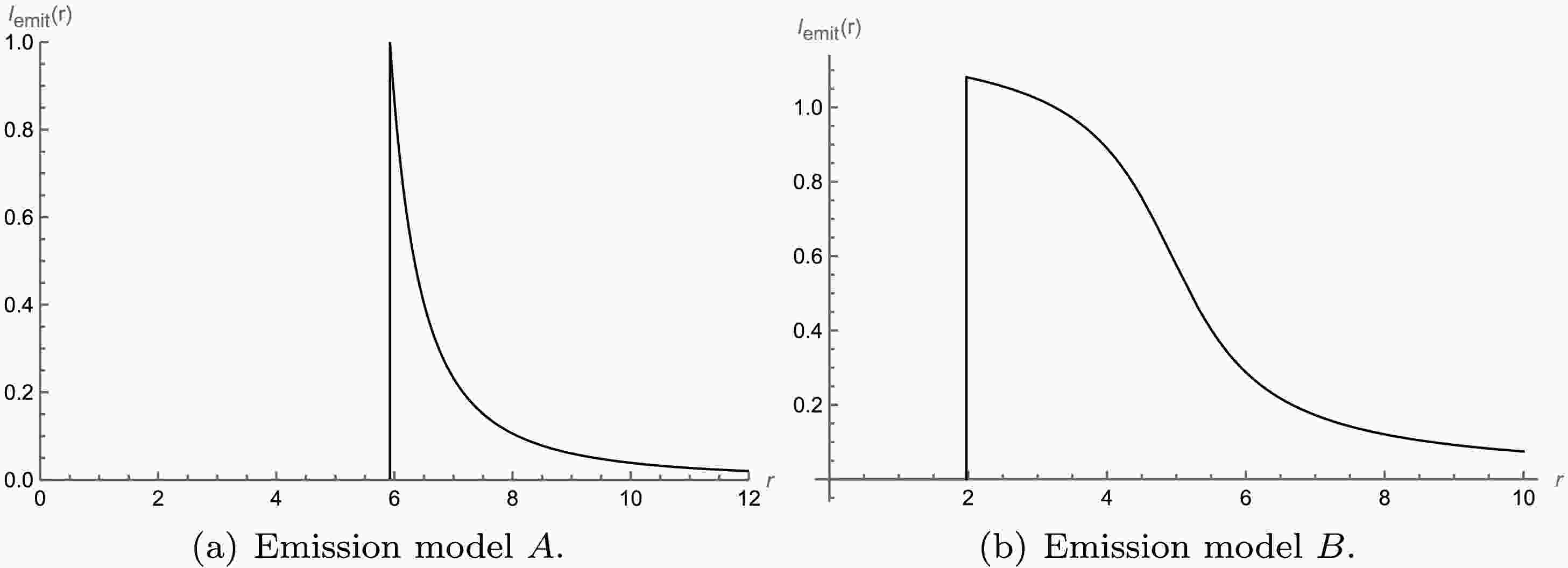 $ \begin{aligned} I_A^{{\rm{em}}}(r)= \begin{cases}0 & r<r_{i s c o}, \\ \left(\dfrac{1}{r-\left(r_{i s c o}-1\right)}\right)^2 & r \geq r_{i s c o}.\end{cases} \end{aligned} $