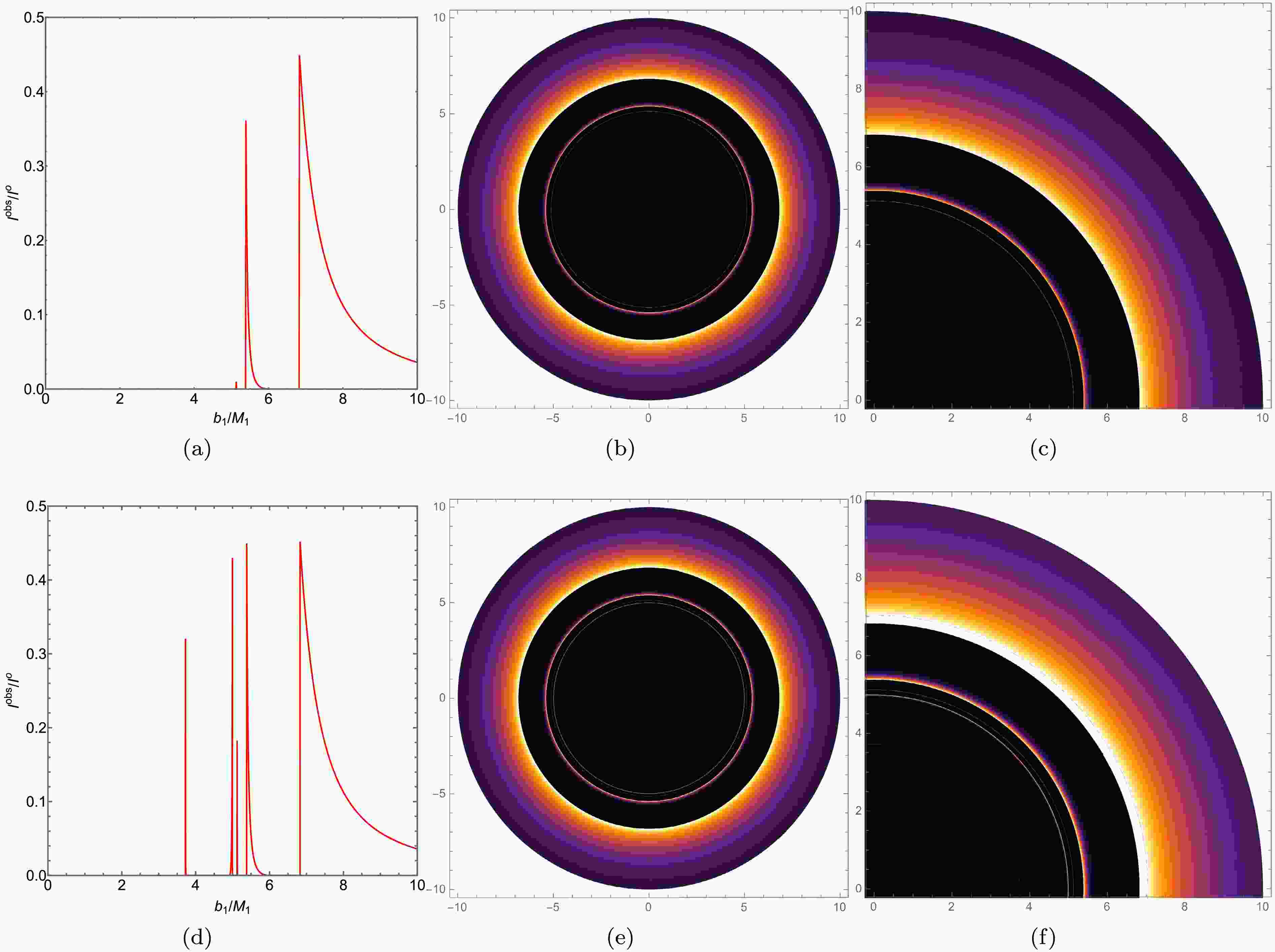 The radiation flux peaks at $ r=r_{i s c o} $ and then decreases with radius, asymptotically approaching zero. For an observer at infinity, the effective radiation originating from within the photon unstable orbit is negligible, as any emission from this region is either highly redshifted or captured by the central object. We have plotted the radiation function, as shown in Fig. 11 (a). Additionally, we have depicted the optical appearance of black holes with the same mass parameter and radiation model A in the first row of Fig. 12. For better comparison, we have computed the observed intensity and constructed the corresponding intensity distribution and local intensity maps for the ATSW using Model A through our ray-tracing method. The results are shown in the second row of Fig. 12. By comparing Figs. 12 (a) and 12 (b), it is evident that BH and ATSW exhibit significant differences in their optical structures, with distinct spatial separations between the direct radiation ring, lens ring, and photon ring. Observing Fig. 12 (a), we find that the observational intensity of ATSW appears at the critical curve $ b_1 \simeq 6.8289 M_1 $, with an intensity of 0.4529, which subsequently decreases to zero. The lens ring is located within a narrow region between the critical curves $ b_1 \simeq 5.3774 M_1 $ and $ b_1 \simeq 5.8891 M_1 $. The photon rings appear near the critical curves at $ b_1 \simeq 3.7221 M_1 $, $ b_1 \simeq 4.9676 M_1 $, and $ b_1 \simeq 5.1213 M_1 $. Compared to BH, intriguingly, two new photon rings emerge in the shadow of ATSW, located near the critical curves at $ b_1 \simeq 3.7221 M_1 $ and $ b_1 \simeq 4.9676 M_1 $, as shown in Figs. 12 (a) and 12 (d). By examining Figs. 12 (b) and 12 (c), we observe that the direct emission ring is near the edge of the black disk, while the lens ring is positioned inside the black disk. Furthermore, Figs. 12 (e) and 12 (f) reveal that the additional photon rings of ATSW are closer to the black disk.