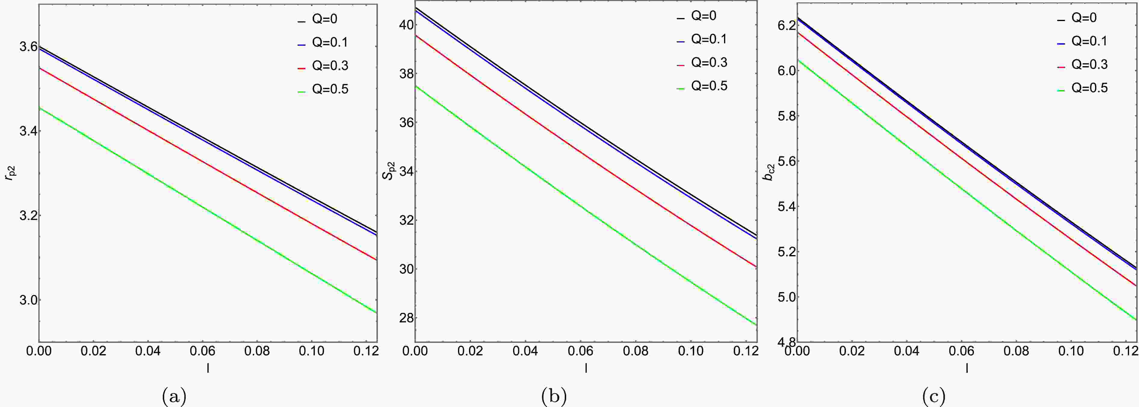 Figure 2.  (color online) In spacetime $ M_2 $, the variation of the photon sphere radius $ r_{p_{2}} $, impact parameter $ b_{c_{2}} $, and the area $ S_{p_{2}} $ enclosed by the photon sphere with the Lorentz-violation parameter l, is depicted in panels (a), (b), and (c), respectively.