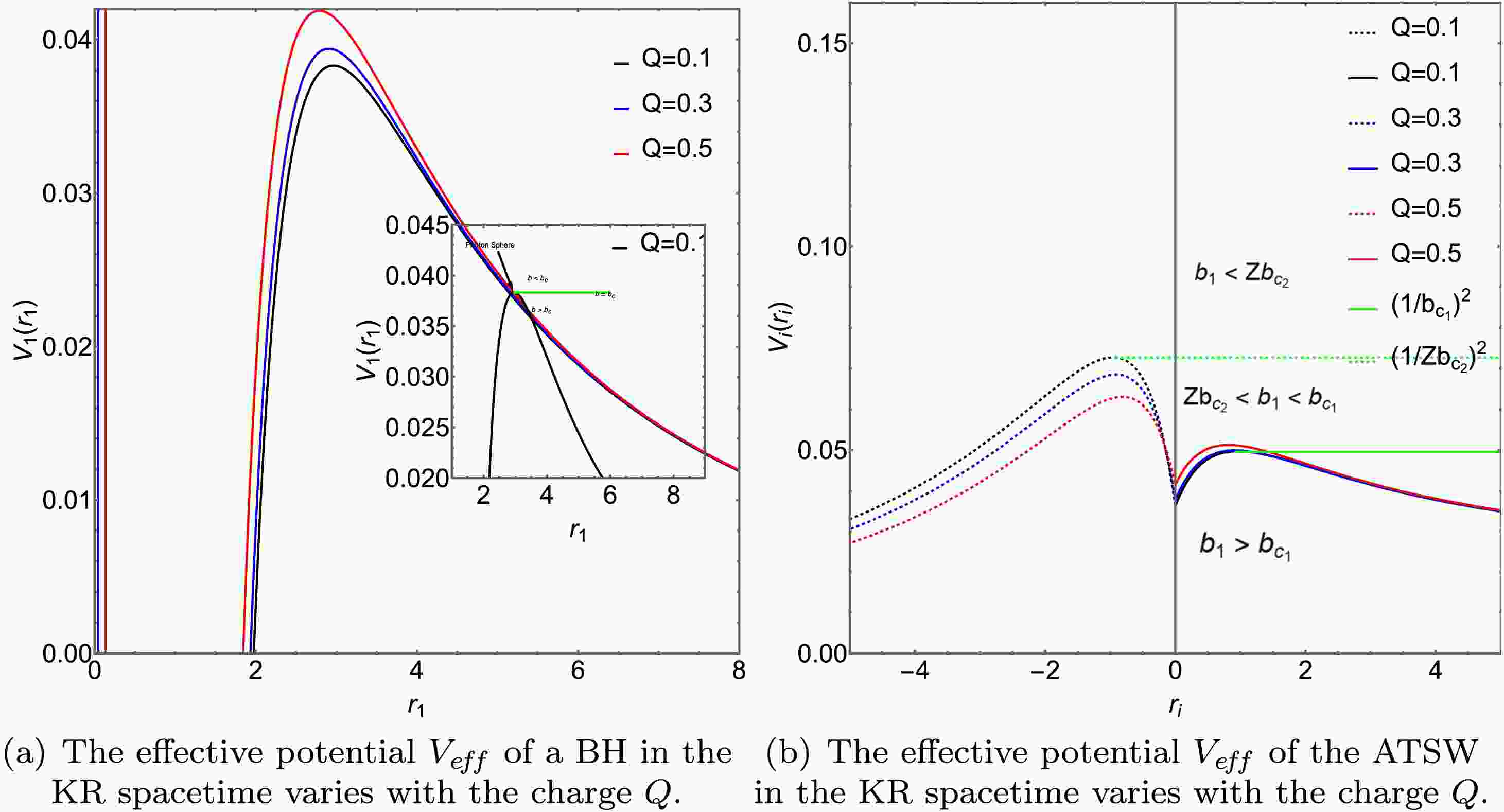 The stability of this orbit is determined by the sign of the second derivative. An unstable circular orbit, which defines the photon sphere, corresponds to a local maximum. By combining Eqs. (5) and (9), we obtain the expression for $ r_{p h_i} $ and $ b_{c_i} $