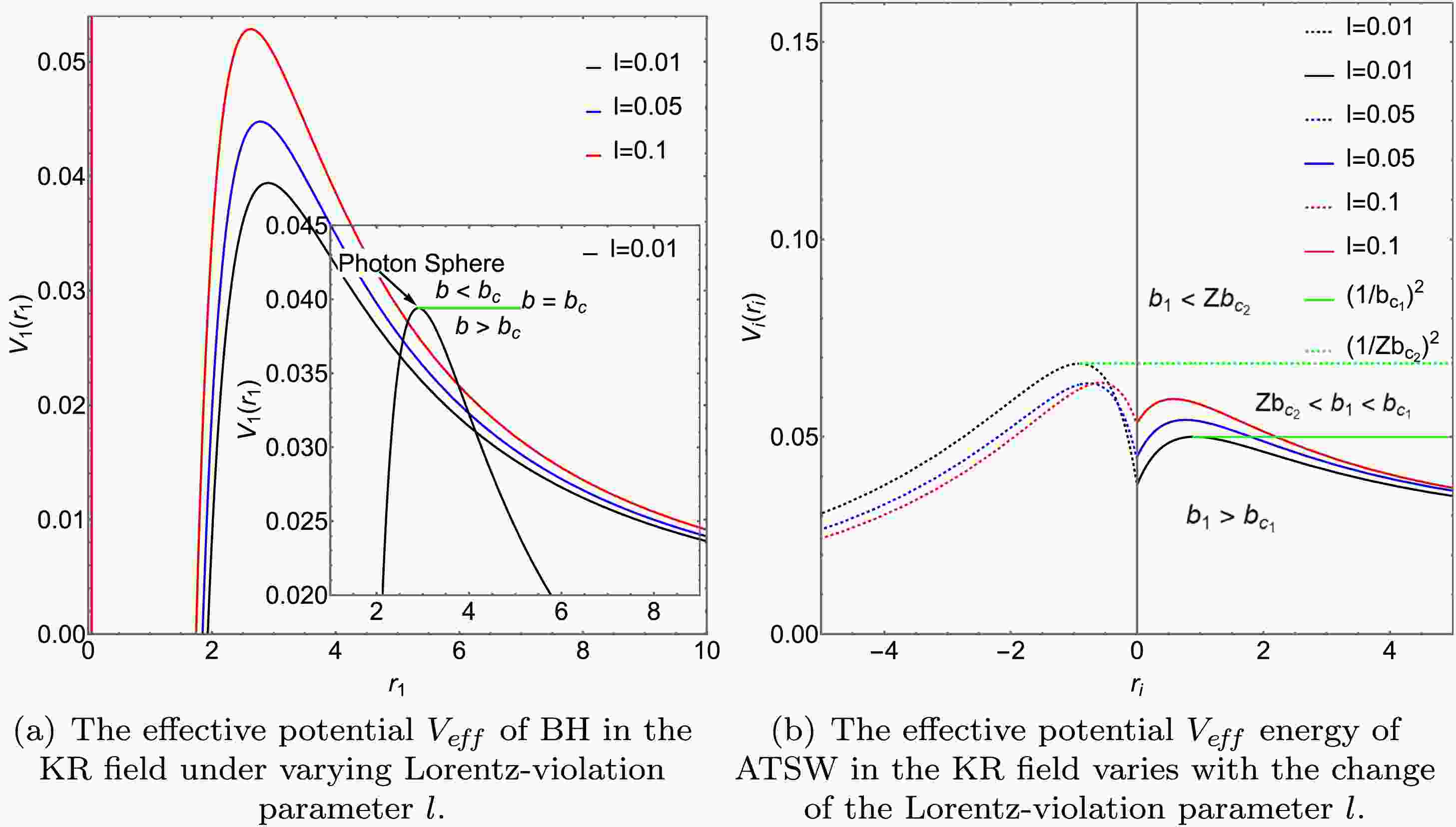 The effective potential energies of BH and ATSW in the KR field are depicted in Figs. 3 and 4, respectively. By examining the effective potential energy of BH (with charge $ Q=0.3 $) in Figs. 3 (a) and 4 (a), we discern three distinct photon trajectories as illustrated in the diagram on the lower right side. For the scenario where $ l=0.01 $ and $ Q=0.1 $, as shown by the black line in Fig. 3, when $ b_1>b_{c_1}=5.11841 $, the gravitational influence results in the deflection of the photon trajectory. When $ b_1=b_{c_1} $, the photon will perpetually orbit around the BH in a circular path. When $ b_1<b_{c_1} $, due to the intense gravitational force, the photon will directly plunge into the BH. Furthermore, it is noted that with the increase in charge Q and the Lorentz-violation parameter l, the effective potential energy of the BH also rises, and the position corresponding to the peak shifts inward.