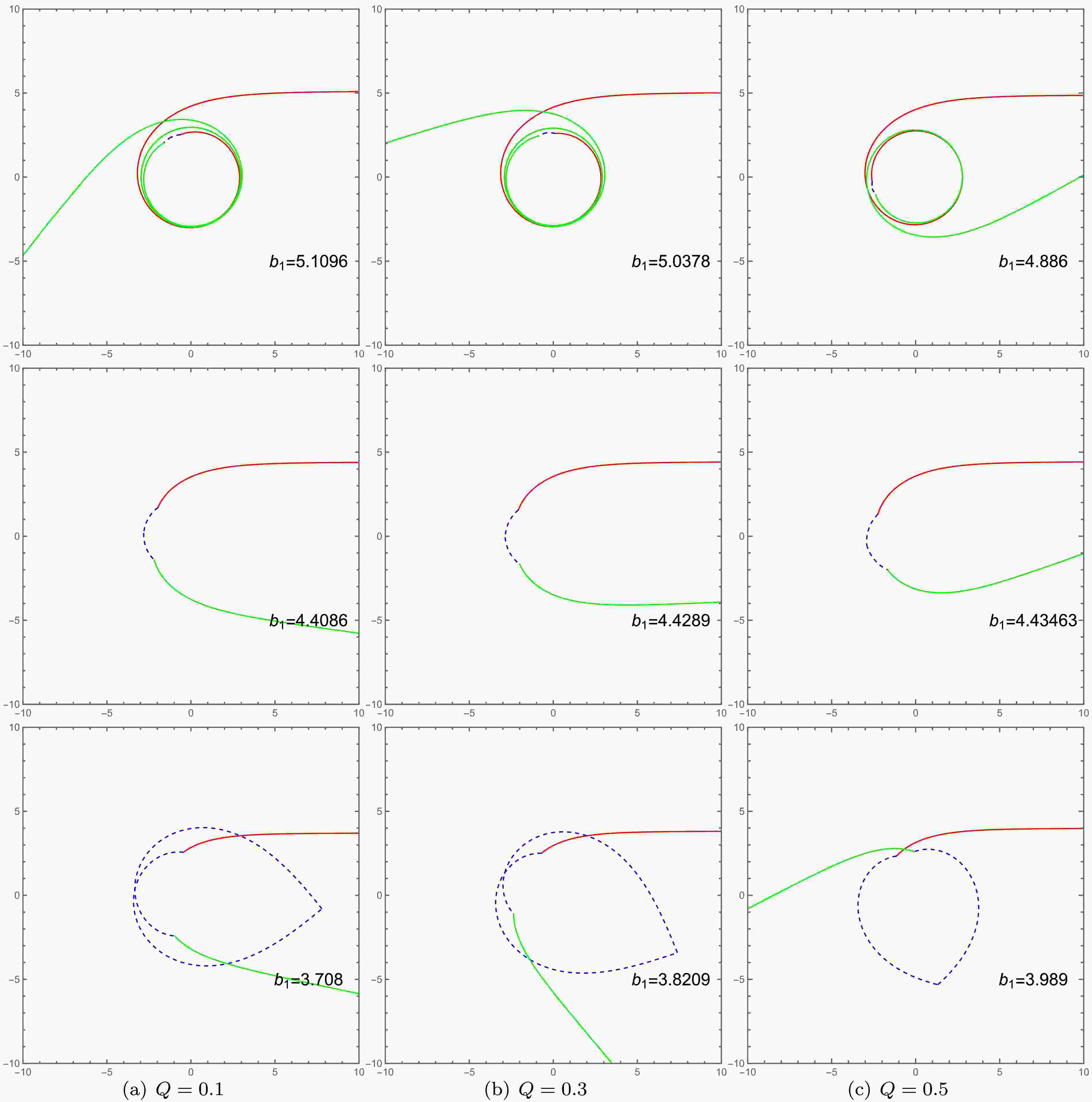 Figure 5.  (color online) The influence of the charge Q on photon trajectories in polar coordinates $ \left(r_1, \varphi\right) $, specifically for impact parameters in the range $ Zb_{c_2}<b_1<b_{c_1} $. The first, second, and third rows correspond to the cases of $ Q = 0.1 $, $ Q = 0.3 $, and $ Q = 0.5 $, respectively. The trajectories are denoted as follows: the red lines represent incident photons in spacetime $ M_1 $, the green lines represent outgoing photons in spacetime $ M_1 $, and the blue dashed lines depict the photon trajectories within spacetime $ M_2 $. The parameters are fixed at $ l = 0.01 $, $ R = 2.6 $, $ M_2=1 $, and $ M_2=1.2 $.