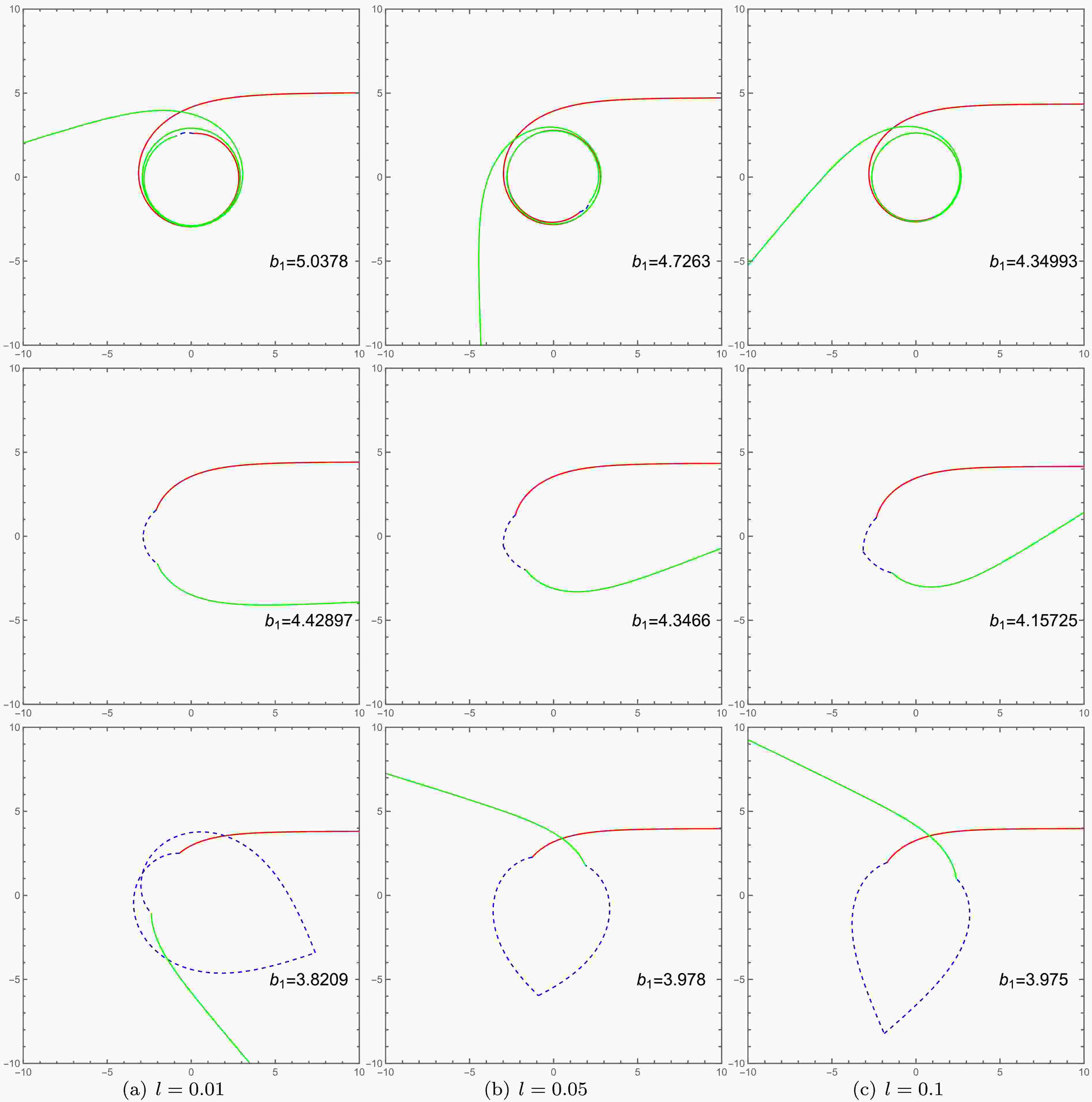 Figure 6.  (color online) Plotted in polar coordinates $ \left(r_1, \varphi\right) $, this figure illustrates the dependence of photon trajectories in spacetime $ M_i $ on the Lorentz-violation parameter l, for impact parameters in the range $ Zb_{c_2}<b_1<b_{c_1} $. The first, second, and third rows correspond to $ l=0.01 $, $ l=0.05 $, and $ l=0.1 $, respectively. The red curves represent incident photons in spacetime $ M_1 $, the green curves represent outgoing photons in spacetime $ M_1 $, and the blue dashed curves depict trajectories within spacetime$ M_2 $. The parameters are fixed at $ Q=0.3 $, $ R =2.6 $, $ M_1= 1 $, and $ M_2 = 1.2 $.