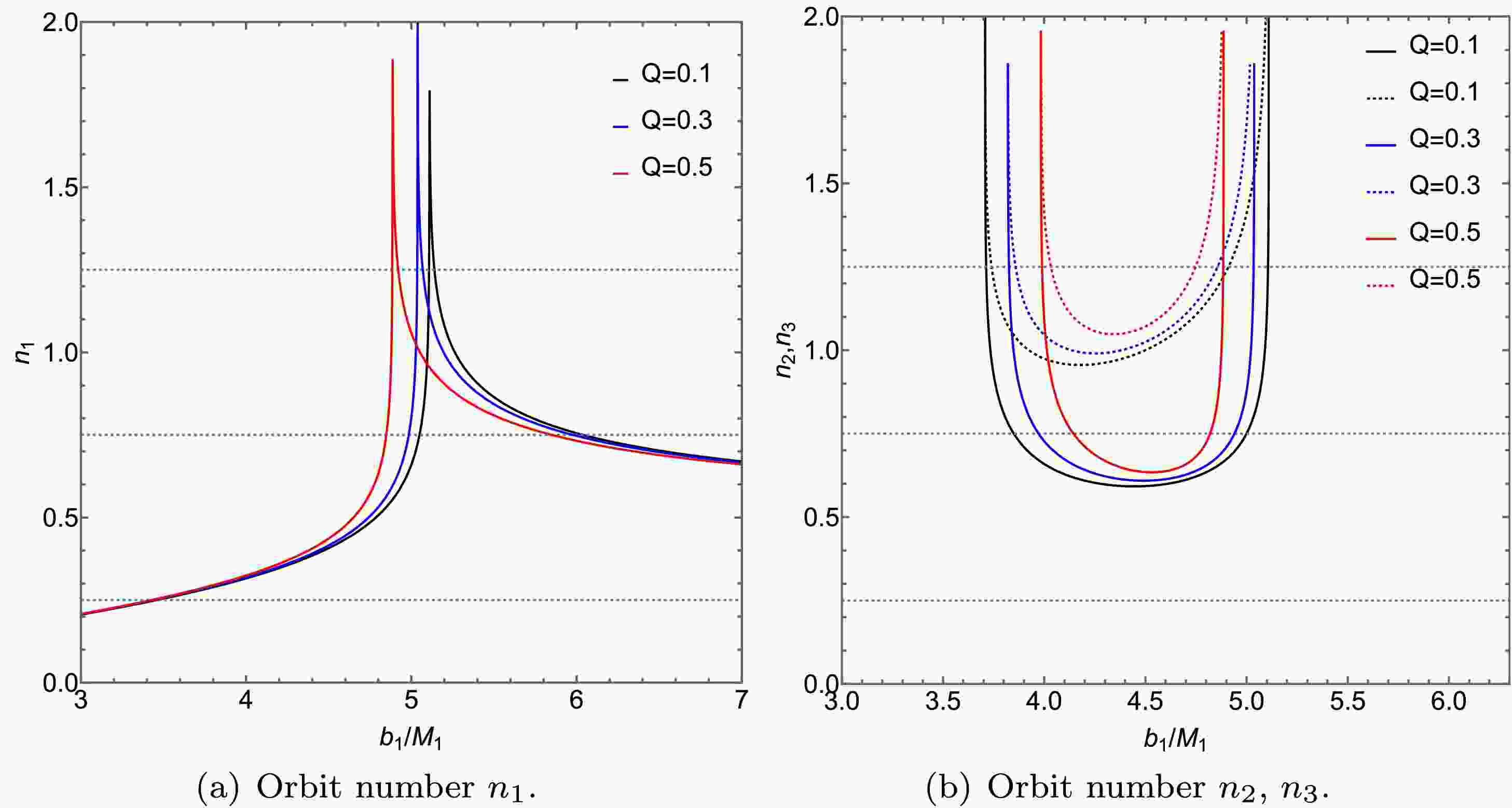 Figure 7.  (color online)A diagram illustrating the relationship between the number of photon trajectories n and the impact parameter $ b_1 $ around an ATSW (with $ l = 0.01 $) in a KR field is presented. The left panel displays the trajectory count $ n_1 $, while the right panel shows the counts for $ n_2 $ (solid lines) and $ n_3 $ (dashed lines). The results for different charge values are compared: $ Q = 0.1 $ (black lines), $ Q = 0.3 $ (blue lines), and $ Q = 0.5 $ (red lines). The parameters are fixed at $ R = 2.6 $, $ M_1 = 1 $, and $ M_2 = 1.2 $.