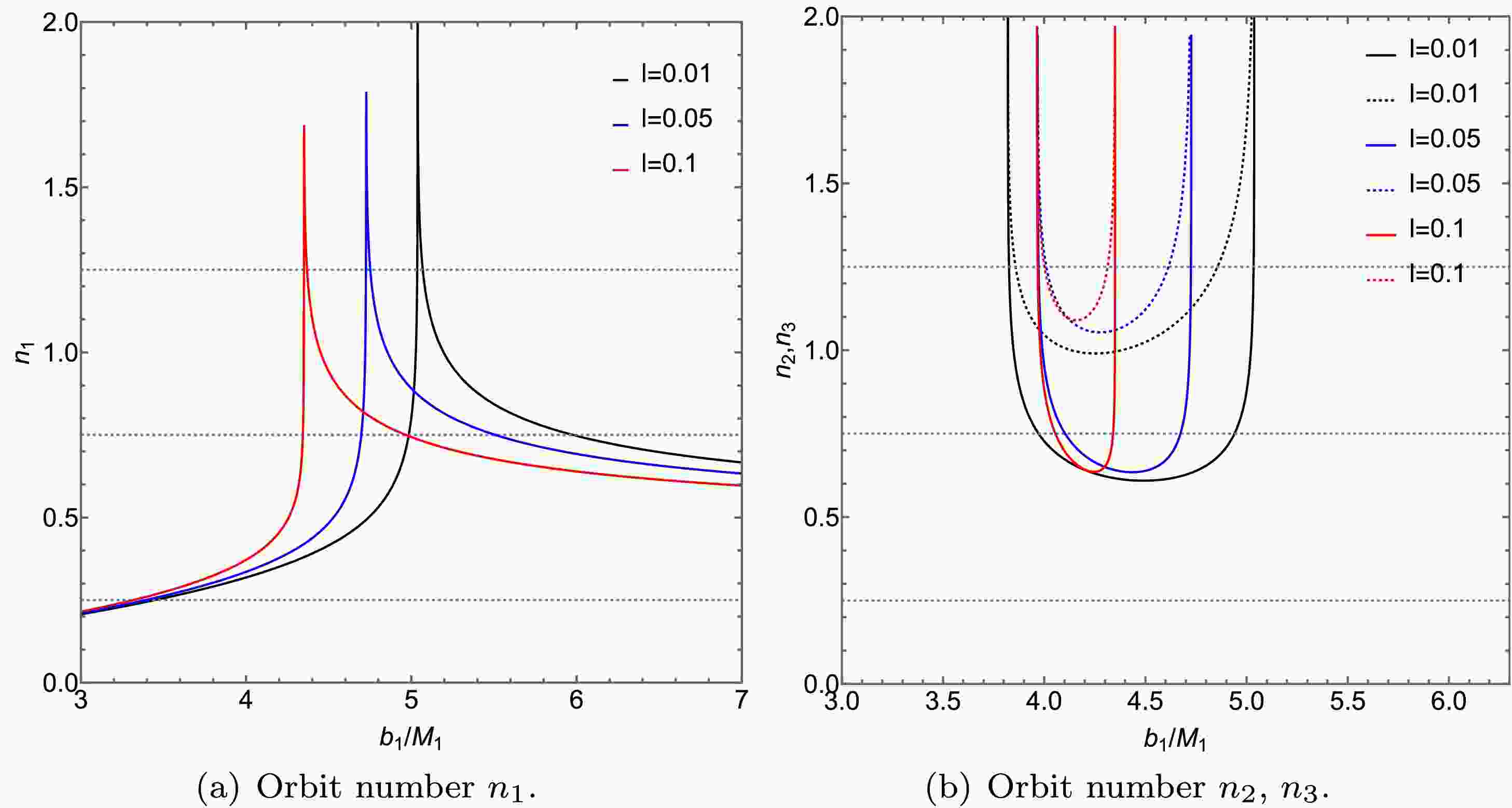 Figure 8.  (color online) In the KR field, we present the relationship between the number of photon trajectories n with different l-values and the collision parameter $ b_1 $ around the ATSW (with $ Q=0.3 $). The left figure shows the trajectory count for $ n_1 $, while the right figure illustrates the trajectory counts for $ n_2 $ (solid lines) and $ n_3 $ (dashed lines). We analyze the trajectory counts for photons under different Lorentz-violation parameters l: $ l=0.01 $ (black lines), $ l=0.05 $ (blue lines), and $ l=0.1 $ (red lines). The parameters are set as $ R=2.6 $, $ M_1 = 1 $, and $ M_2 = 1.2 $.