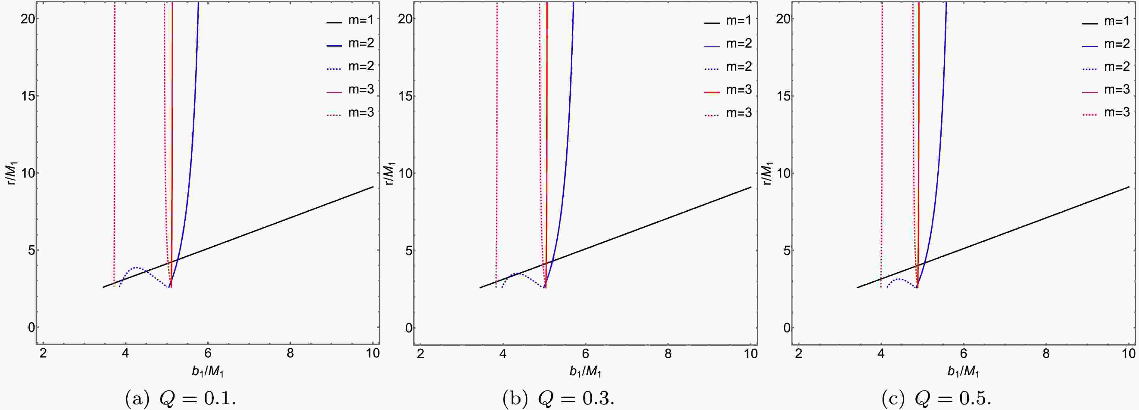 With $ r_m\left(b_1\right) $ represents the transfer function, and $ b_1 $ denotes the impact parameter. The radial coordinate of the intersection point between the thin accretion disk and the photon trajectory is determined by the transfer function $ r_m\left(b_1\right) $. When $ m=1 $, $ m=2 $, and $ m=3 $, they correspond to the direct emission, lensing ring, and photon ring of the thin accretion disk, respectively. The relationship between the transfer function and the impact parameter is illustrated in Figs. 9 and 10, where we have considered the effects of varying charge and Lorentz -violation parameters.