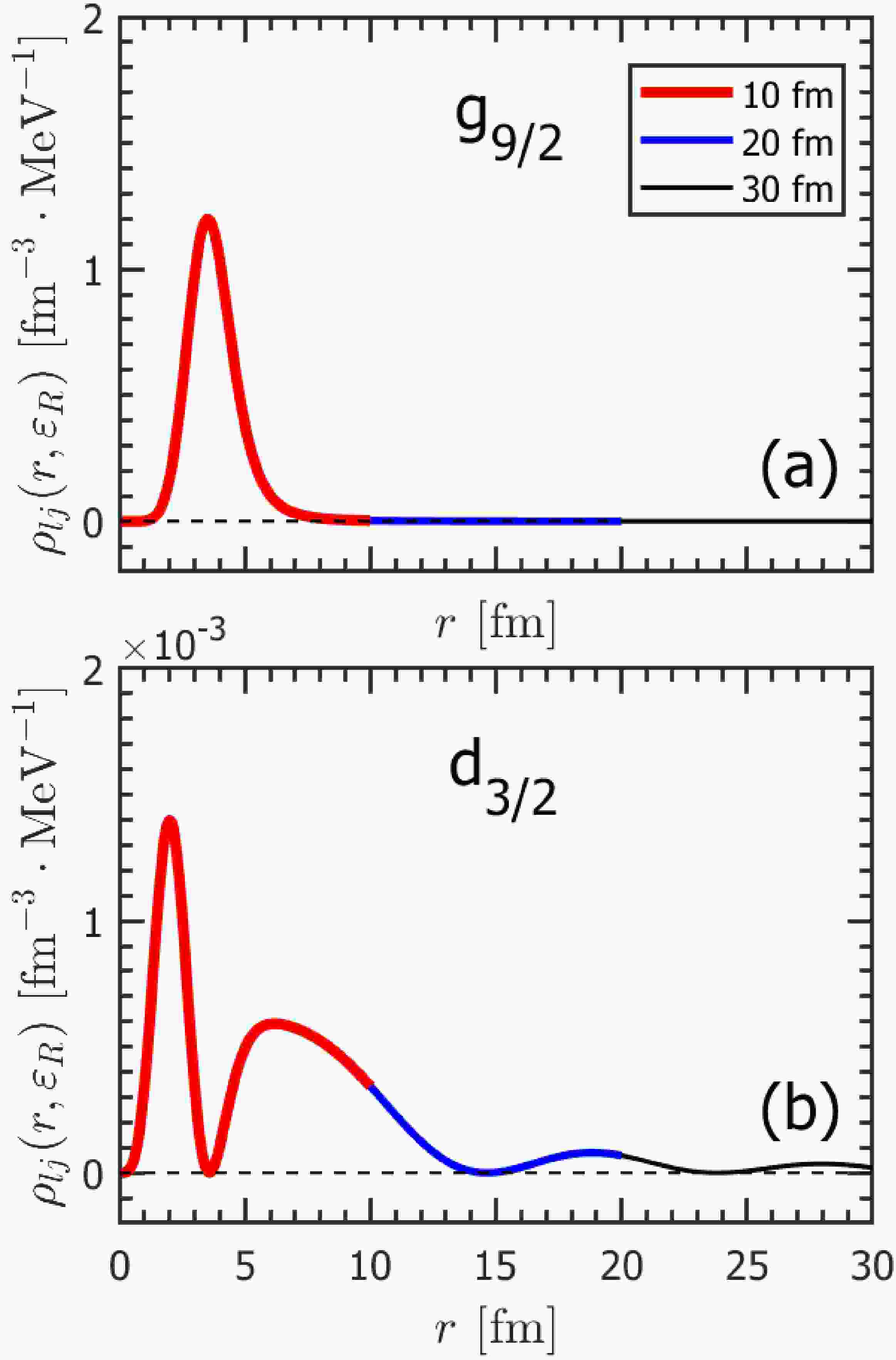 $ n_{lj}(\epsilon) $ where$ \epsilon=\varepsilon_r+\mathrm{i}\varepsilon_i $ can be calculated using the GF with scanning the real and imaginary parts of energies$ \varepsilon_r $ and$ \varepsilon_i $ in the fourth quadrant. It can be demonstrated that [58], near the energy of resonant states$ \epsilon_R=\varepsilon_R -\mathrm{i}\Gamma/2 $ ,$ \begin{array}{*{20}{l}} n_{lj}(\epsilon) & =\delta(\epsilon-\epsilon_R) \\ & =\left\{\begin{array}{c} - \dfrac{2 j+1}{\pi} \int \mathrm{d} r \operatorname{Im}\left[\mathcal{G}_{lj}(r, r ; \epsilon)\right], \\ \text { if } \varepsilon_i>-\Gamma / 2 , \\ \dfrac{2 j+1}{\pi} \int \mathrm{d} r \operatorname{Im}\left[\mathcal{G}_{lj}(r, r ; \epsilon)\right], \\ \text { if } \varepsilon_i<-\Gamma / 2 . \end{array}\right. \end{array} $