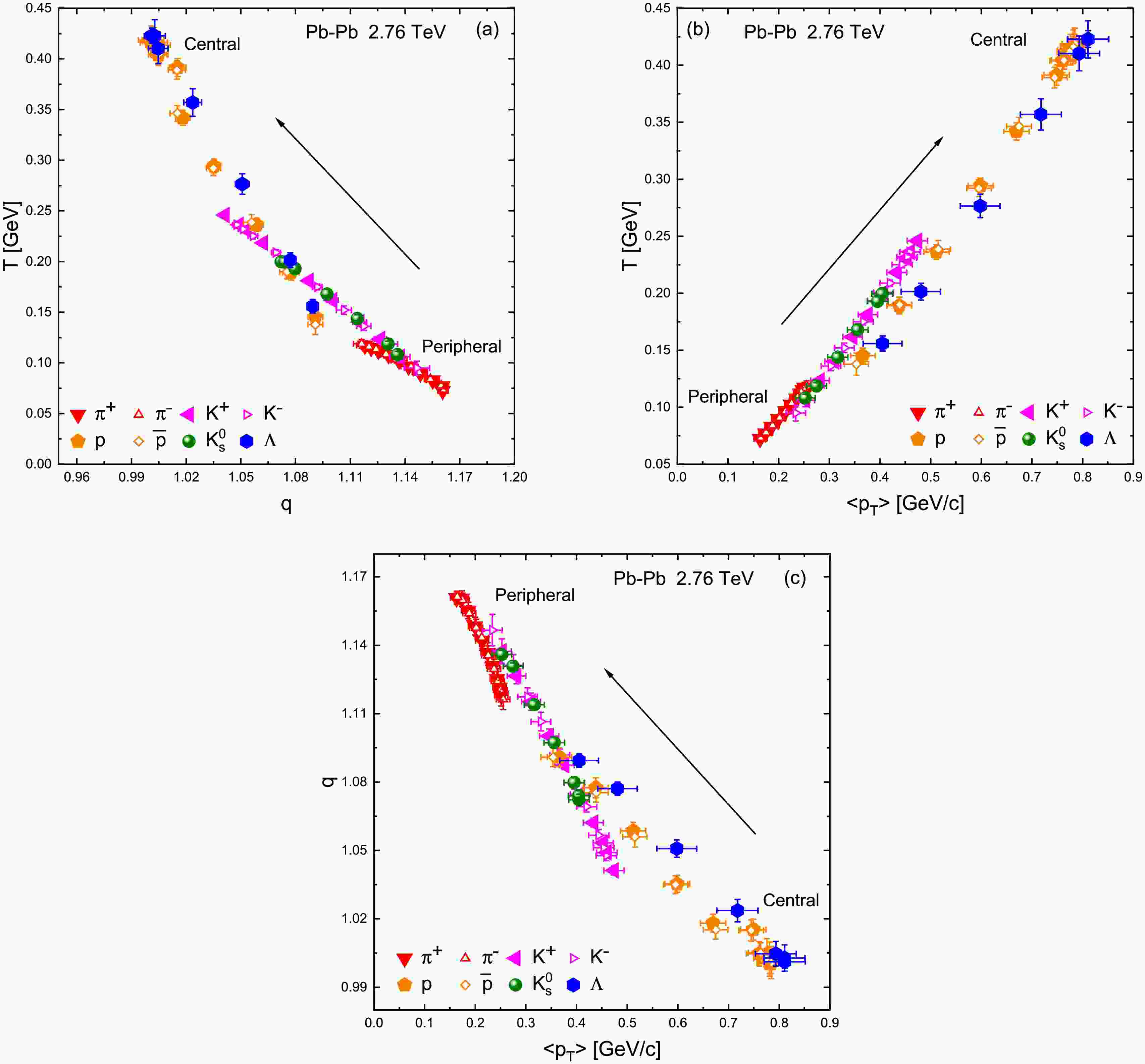 $ \langle p_T\rangle $ and (c) q and$ \langle p_T\rangle $ .Figure 4b reveals a tight direct correlation between T and