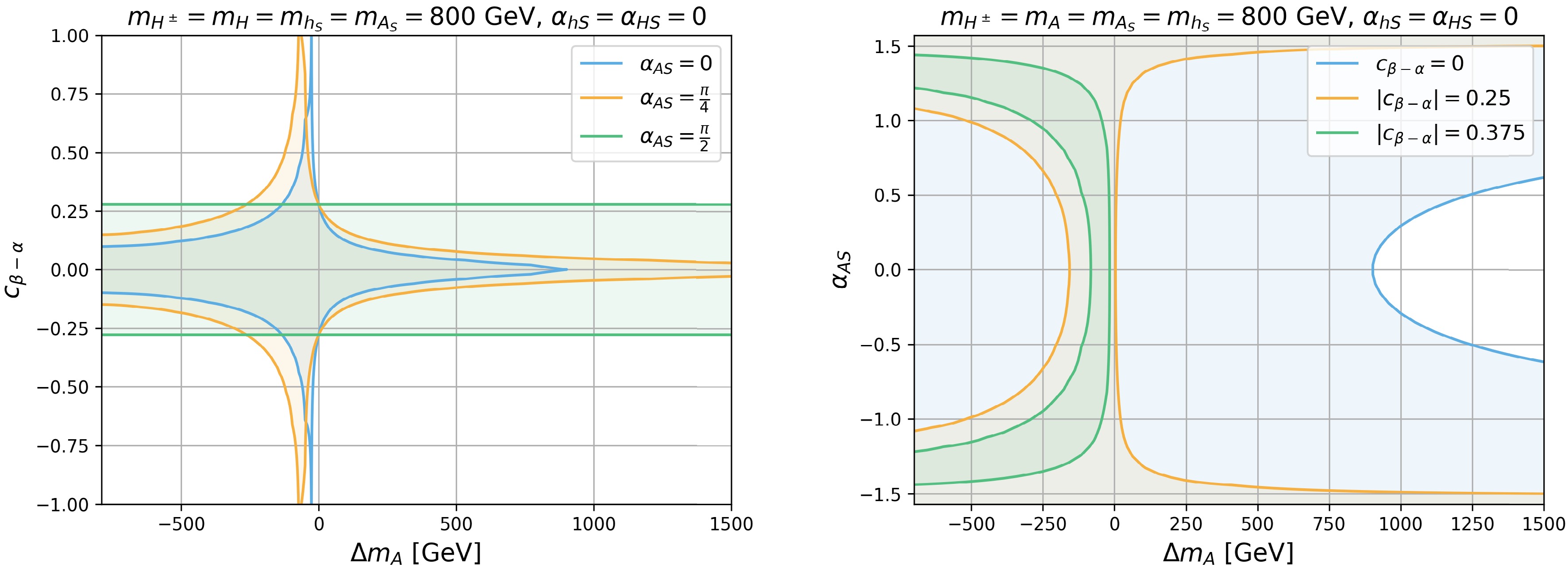 $ \Delta m_{A} $ vs.$ c_{\beta-\alpha} $ plane (left panel) for$ \alpha_{HS} $ =0 (blue),$ \pi/4 $ (orange), and$ \pi/2 $ (green) and the$ \Delta m_{A} $ vs.$ \alpha_{AS} $ plane (right panel) for$ |c_{\beta-\alpha}| $ =0 (blue), 0.25 (orange), and 0.375 (green). We set$ m_{H^\pm}=m_H=m_{h_S}=m_{A_S}=800 $ GeV and$ \alpha_{hS}=\alpha_{HS}=0 $ .The right panel of Fig. 10 presents the 95% C.L. allowed region in