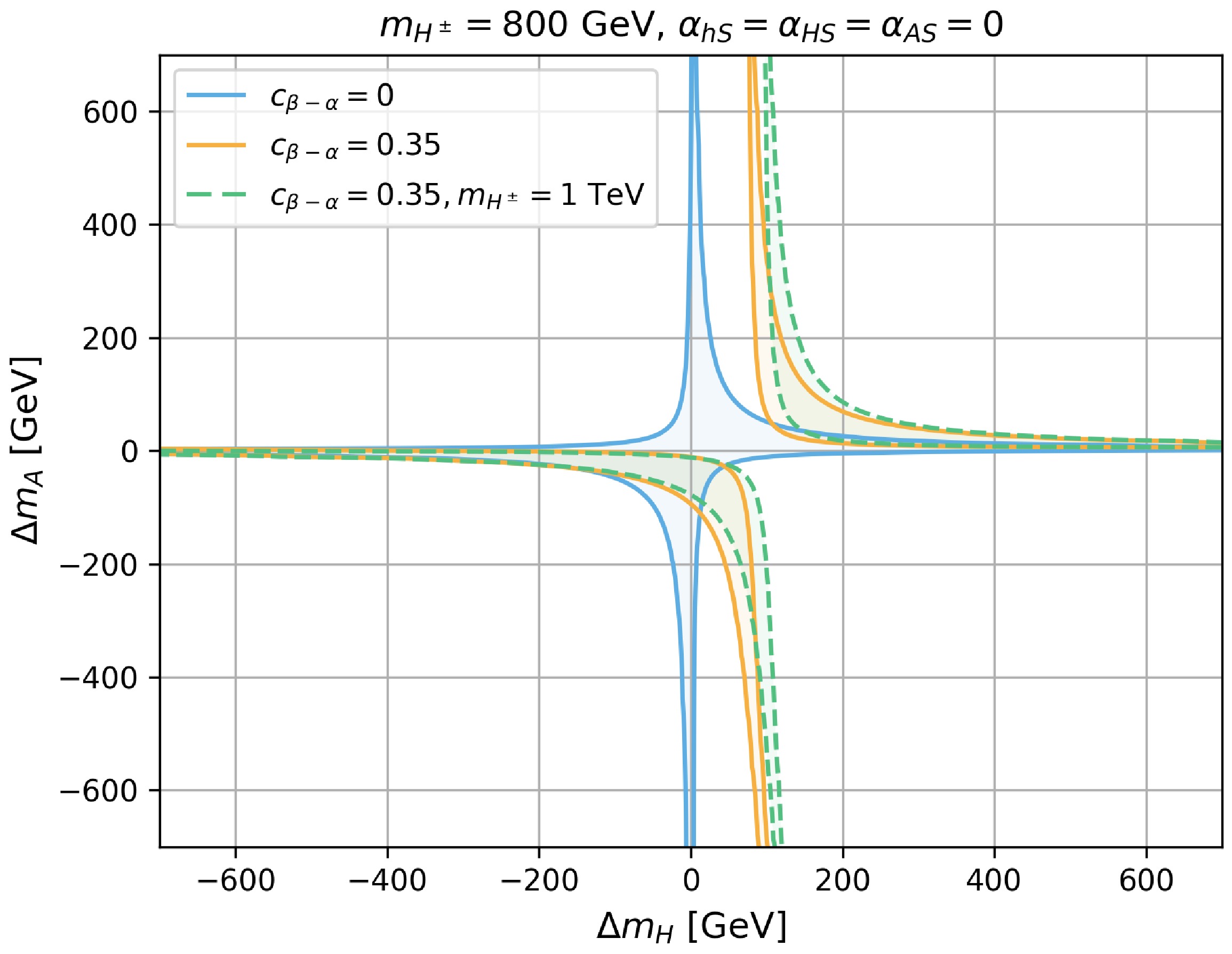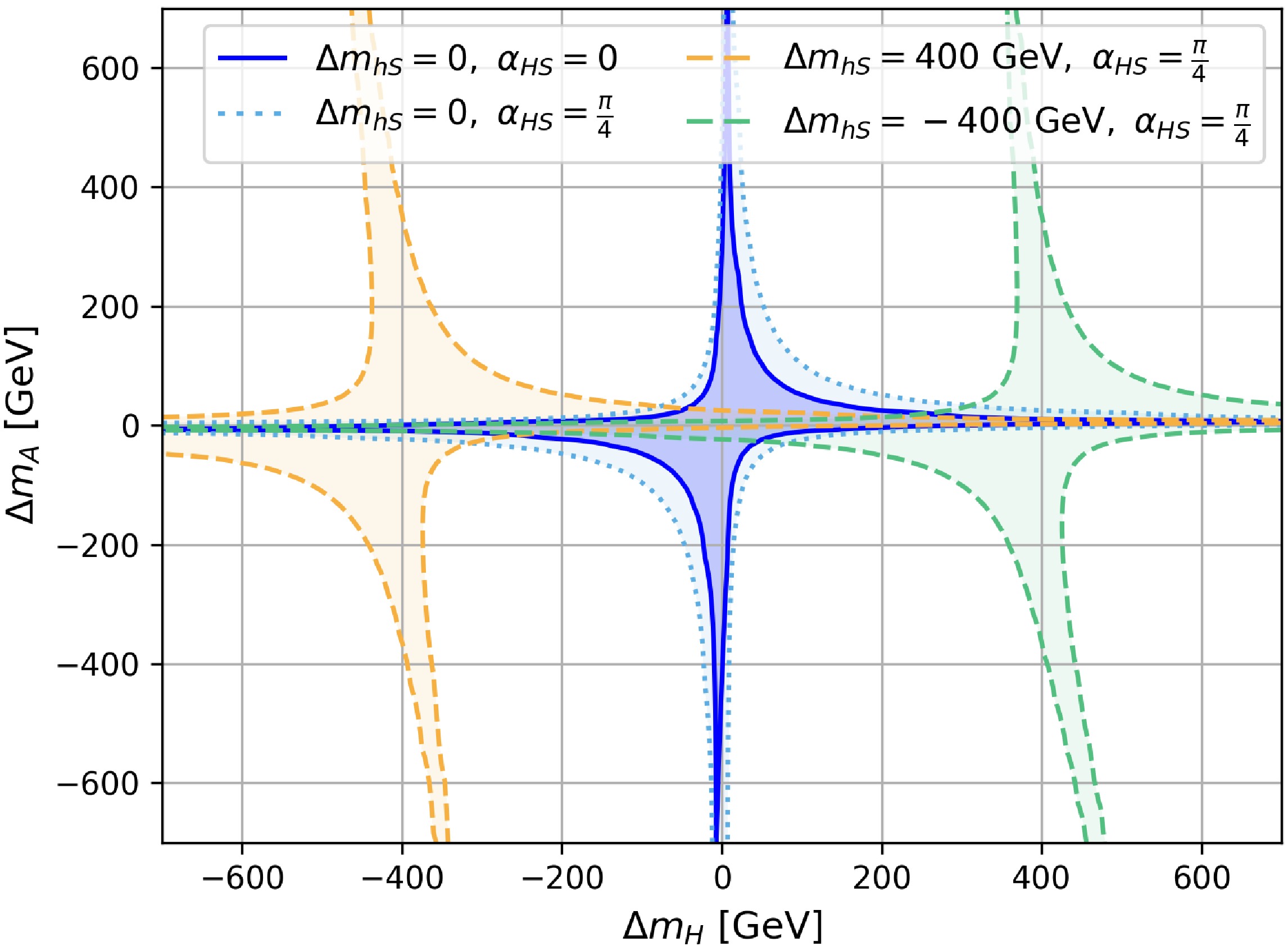 $ \Delta m_H $ vs.$ \Delta m_A $ in Case-III with$ c_{\beta-\alpha}=\alpha_{hS}=\alpha_{AS}=0 $ .$ m_{H^\pm} $ is set to be 800 GeV. The regions enclosed by the dark solid blue and light dashed blue curves indicate$ \Delta m_{hS}=0 $ and$ \alpha_{HS}=0 $ and$ \pi/4 $ , respectively. The orange and green regions indicate$ \Delta m_{hS}=\pm $ 400 GeV, respectively, and$ \alpha_{HS}=\pi/4 $ .When the singlet-like Higgs mass deviates from the charged Higgs mass, for instance,