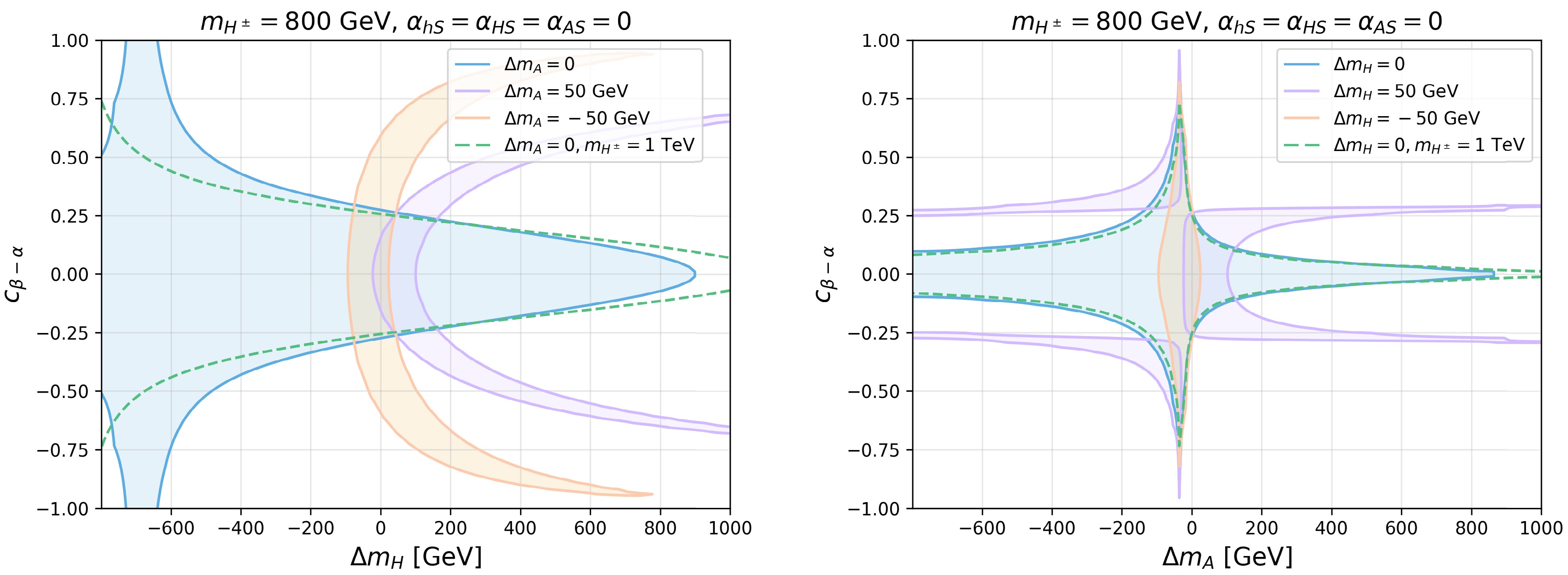 $ c_{\beta-\alpha} $ vs.$ \Delta m_H $ (left) and$ \Delta m_A $ vs.$ c_{\beta-\alpha} $ (right). The other parameters are chosen as$ \alpha_{HS}=\alpha_{hS}=\alpha_{AS}=0 $ and$ m_H^\pm = 800 $ GeV (solid curves). The blue, purple, and orange regions correspond to$ \Delta m_{A,H}=0,\ 50,\ -50 $ GeV, respectively. The green dashed curves represent$ m_{H^\pm} = 1000 $ GeV and$ \Delta m_{A,H=0} $ . -