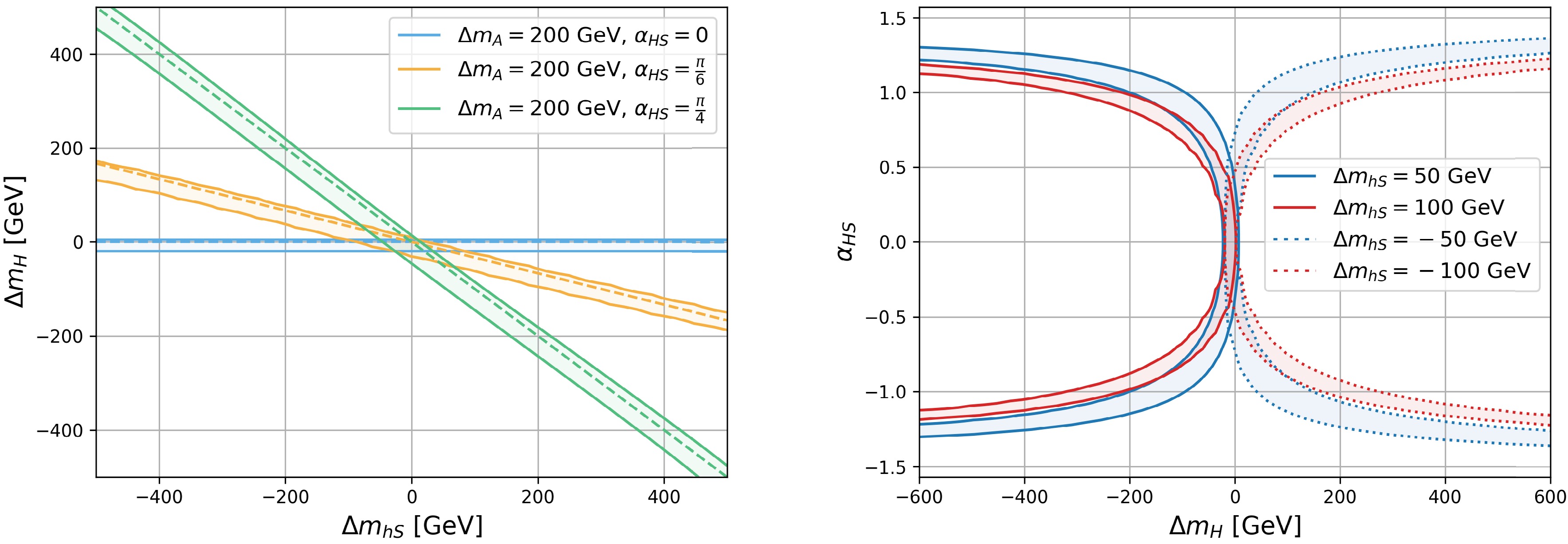 $ m_{h_S} $ ,$ \alpha_{hS} $ , and$ \Delta m_A $ . The left panel indicates$ m_{h_S} $ vs.$ \alpha_{hS} $ with varying$ \Delta m_A $ . The blue, orange, and green regions indicate$ \Delta m_A = \Delta m_H=0 $ , 50, 100 GeV, respectively. The right panel indicates$ m_{h_S} $ vs.$ \Delta m_{H,A} $ with varying$ \alpha_{hS} $ . The blue, orange, and green regions indicate$ \alpha_{hS}=0 $ ,$ {\pi}/{4} $ , and$ {\pi}/{2} $ , respectively. For both panels, we set$ m_{H^\pm}= 800 $ GeV and$ c_{\beta-\alpha}=\alpha_{HS}=\alpha_{AS}=0 $ .For