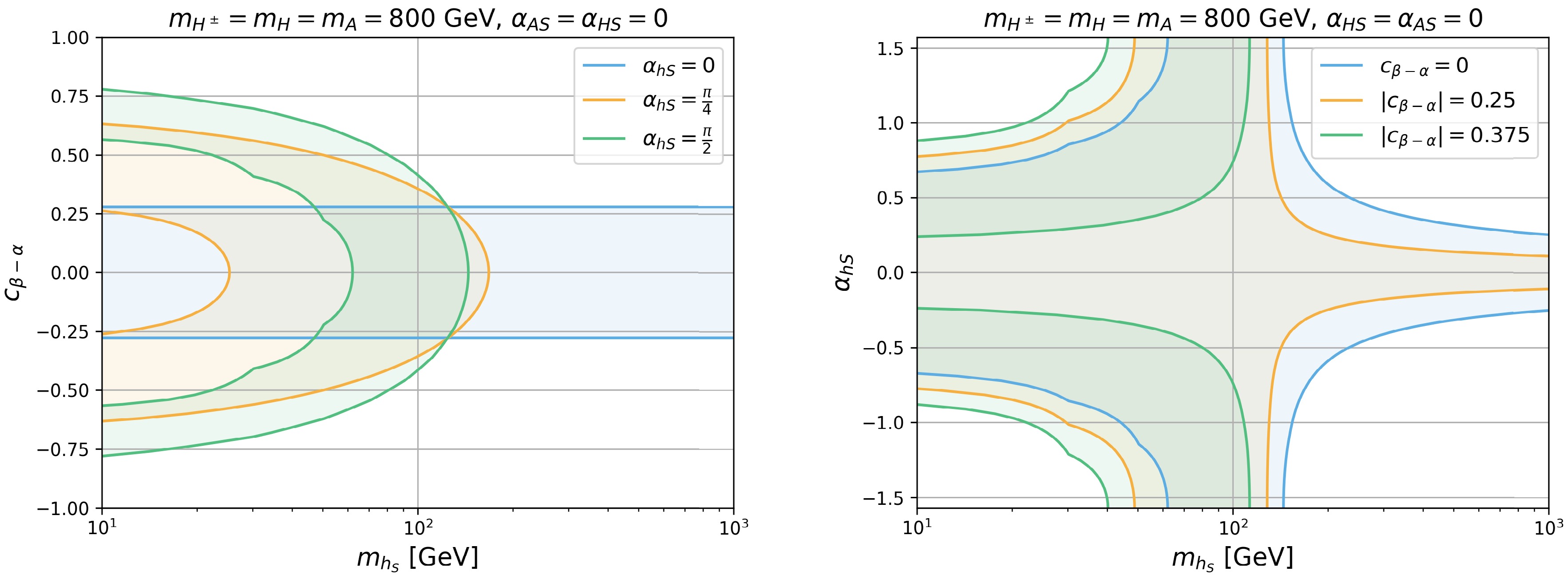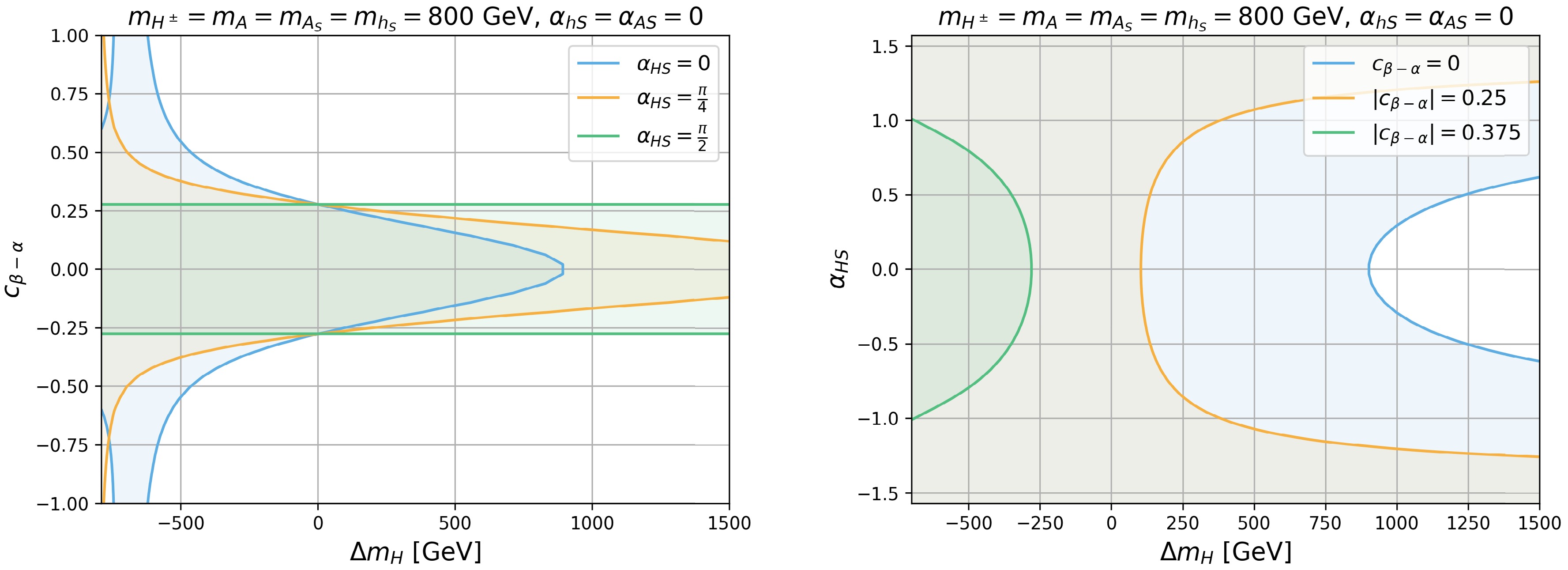$ \Delta m_{H} $ vs.$ c_{\beta-\alpha} $ plane (left panel) for$ \alpha_{HS} $ =0 (blue),$ \pi/4 $ (orange), and$ \pi/2 $ (green) and the$ \Delta m_{H} $ vs.$ \alpha_{HS} $ plane (right panel) for$ |c_{\beta-\alpha}| $ =0 (blue), 0.25 (orange), and 0.375 (green). We set$ m_{H^\pm}=m_A= m_{h_S}= $ $ m_{A_S}=800 $ GeV and$ \alpha_{AS}=\alpha_{hS}=0 $ .The right panel of Fig. 9 presents the