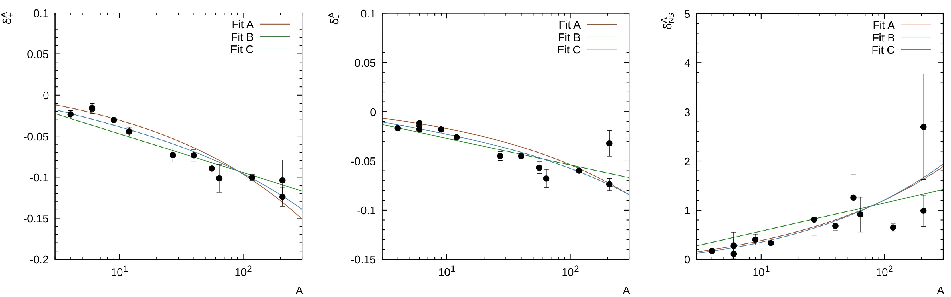 $ i = \pm $ or NS, and we note that$ \delta^A_\pm $ and$ \delta^A_{NS} $ have to be zero at$ A = 1 $ . Hereafter, the parameterizations in Eqs. (26), (27), and (28) are referred to as Fit A, Fit B, and Fit C, respectively. Based on the data from Table 1, we determine all parameters involved in the fits and list them in Table 2. The fitted nuclear dependence of$ \delta^A_\pm $ and$ \delta^A_{NS} $ is shown in Fig. 1. As can be seen from the Table 2 and Fig. 1, large uncertainties in the experimental data do not allow us to choose which of the parameterizations in Eqs. (26)−(28) is better. Thus, in accordance with the inaccuracies of the experimental data, each case from Eqs. (26)−(28) can be used for applications.$ a_+ $ $ a_- $ $ a_{NS} $ $ b_+ $ $ b_- $ $ b_{NS} $ Fit A $ -0.027 \pm 0.001 $ $ -0.015 \pm 0.002 $ $ 0.33 \pm 0.04 $ Fit B $ -0.021 \pm 0.001 $ $ -0.012 \pm 0.001 $ $ 0.25 \pm 0.04 $ Fit C $ -0.020 \pm 0.004 $ $ -0.012 \pm 0.002 $ $ 0.36 \pm 0.13 $ $ 0.029 \pm 0.015 $ $ 0.016 \pm 0.007 $ $ 0.12 \pm 0.54 $ Table 2. Parameters