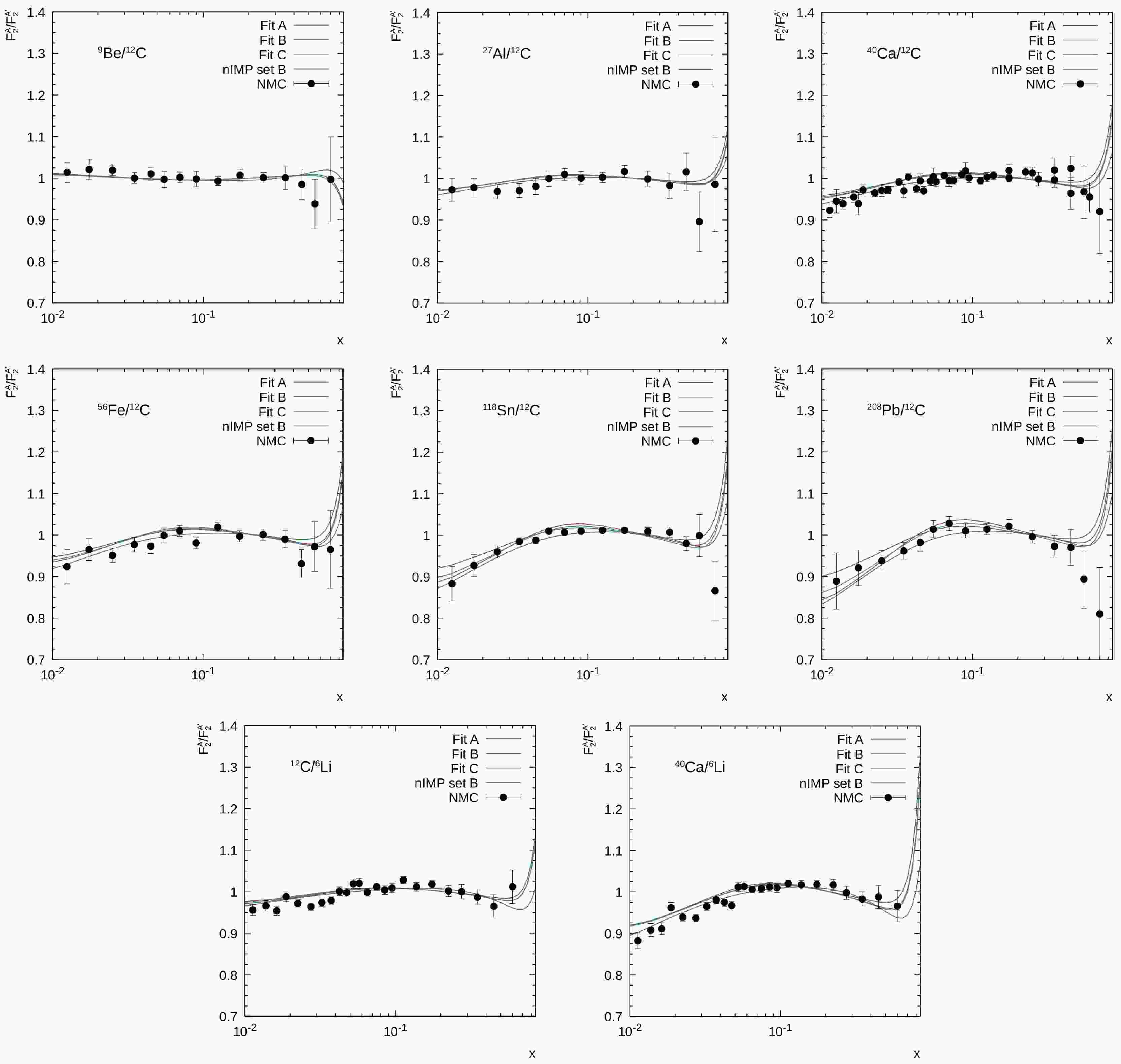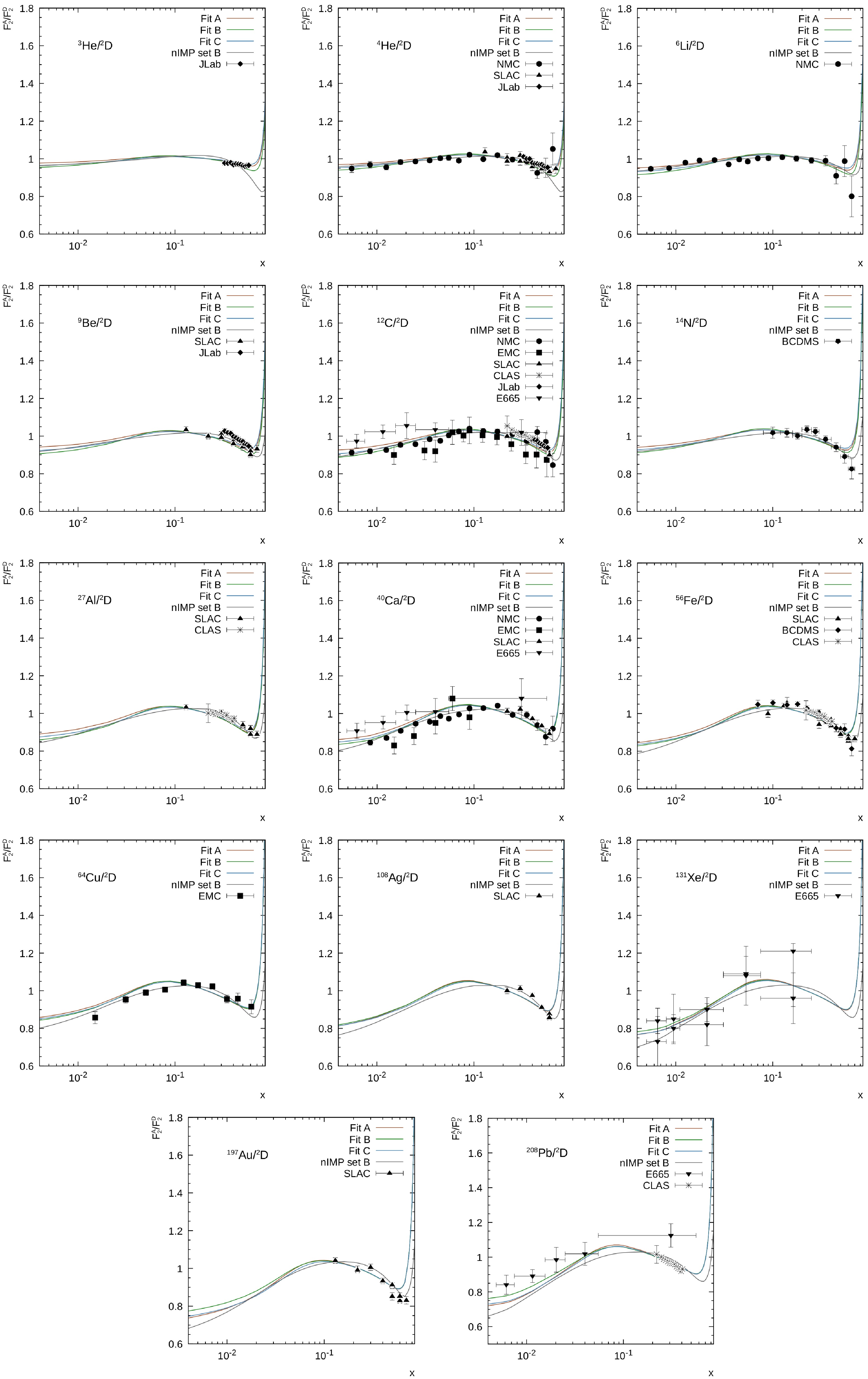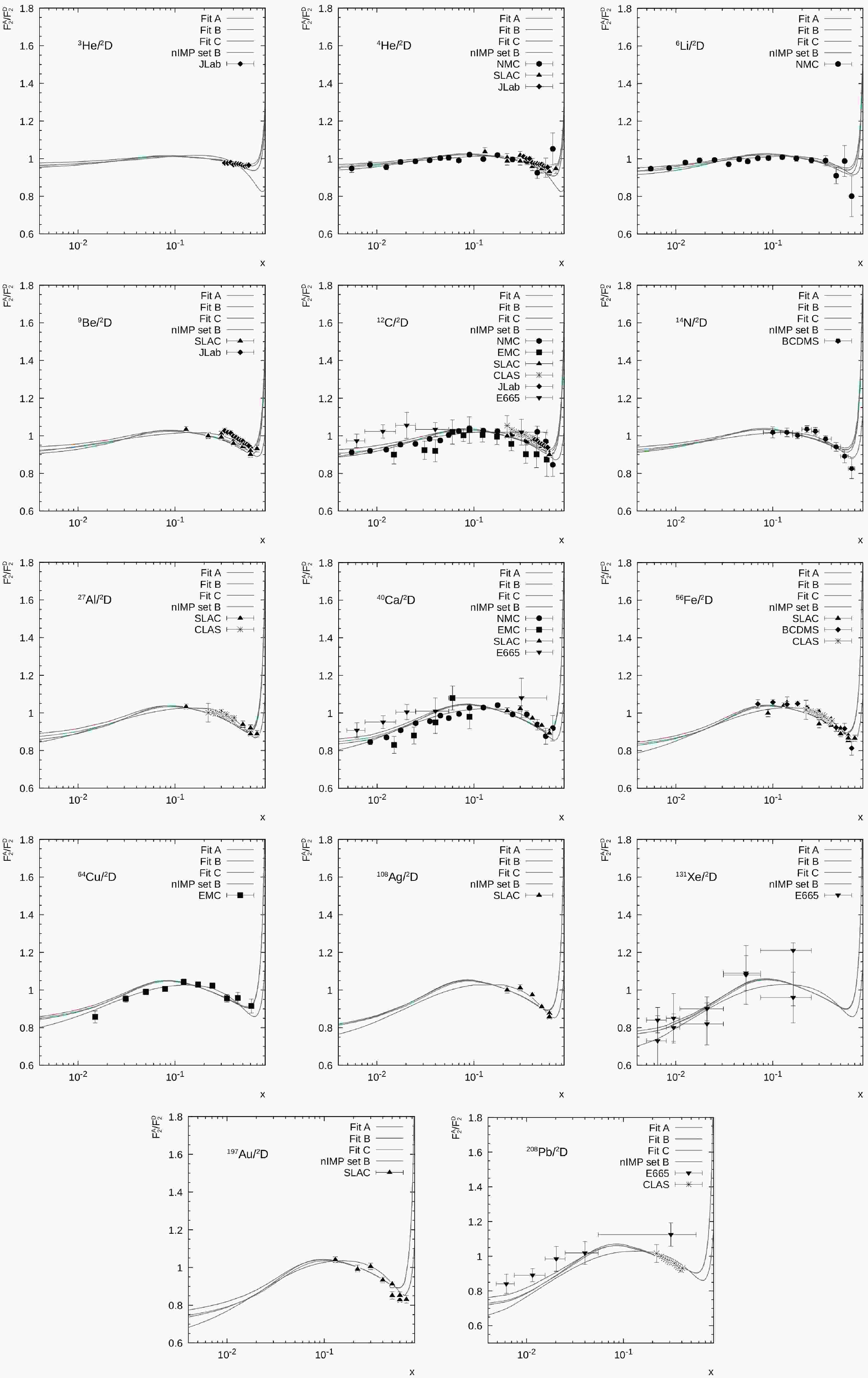 $ \chi^2/n.d.f. $ , are also presented. The fitting procedure was performed using the algorithm as implemented in the commonly used ɢɴᴜᴘʟᴏᴛ package [87]. One can see that reasonably good values of$ \chi^2/n.d.f. $ are achieved in most cases. The newly fitted values of$ \delta^A_+ $ , responsible for nuclear shadowing effects, are very close to the ones obtained earlier [56] via analysis on 4He, 12C, and 40Ca alone. This is because$ \delta^A_+ $ fits are mainly sensitive to the low-x data, for which the same PDF asymptotics are used in the both calculations. However, our results for$ \delta^A_- $ and$ \delta^A_{NS} $ , essential for larger x and responsible for the description of the EMC and/or anti-shadowing effects, differ from those of earlier analyses [54, 56]. This difference arises owing to various reasons. First, the present consideration is based on the updated PDFs, which are more accurately determined in a wide region of x and$ Q^2 $ . Second, we took the effects of Fermi motion into account, unlike previous analyses. Third, we performed the fit over the entire x range, while previous analyses [54, 56] were performed in restricted kinematical regions ($ x \lt 0.1 $ and$ x \lt 0.7 $ , respectively). Moreover, both these earlier fits were performed with$ \delta_{NS}^A $ corresponding to the study in [57, 58, 59]. In contrast, here, we extracted$ \delta_{NS}^A $ values independently using an extremely extended data set. Nevertheless, the strong difference in determined$ \delta^A_- $ and$ \delta^A_{NS} $ leads to only modest differences in the nuclear modification factor$ R^A $ (see below).A $ \delta^A_{+} $ $ \delta^A_- $ $ \delta^A_{NS} $ Targets N $ \chi^2/n.d.f. $ 4He $ -0.023 \pm 0.004 $ $ -0.017 \pm 0.002 $ $ 0.17 \pm 0.02 $ 4He/2D 42 0.63 6Li $ -0.017 \pm 0.005 $ $ -0.014 \pm 0.003 $ $ 0.29 \pm 0.27 $ 6Li/2D 17 1.39 6Li $ -0.015 \pm 0.005 $ $ -0.012 \pm 0.002 $ $ 0.11 \pm 0.12 $ 12C/6Li 24 1.18 6Li $ -0.016 \pm 0.006 $ $ -0.018 \pm 0.002 $ $ 0.27 \pm 0.15 $ 40Ca/6Li 24 1.20 9Be $ -0.030 \pm 0.005 $ $ -0.018 \pm 0.003 $ $ 0.40 \pm 0.11 $ 9Be/12C 15 0.22 12C $ -0.044 \pm 0.006 $ $ -0.026 \pm 0.002 $ $ 0.33 \pm 0.04 $ 12C/2D 47 1.61 27Al $ -0.073 \pm 0.008 $ $ -0.045 \pm 0.004 $ $ 0.81 \pm 0.32 $ 27Al/12C 15 0.48 40Ca $ -0.074 \pm 0.007 $ $ -0.045 \pm 0.003 $ $ 0.68 \pm 0.10 $ 40Ca/2D 32 2.05 56Fe $ -0.089 \pm 0.011 $ $ -0.057 \pm 0.006 $ $ 1.26 \pm 0.47 $ 56Fe/12C 15 0.72 64Cu $ -0.101 \pm 0.017 $ $ -0.068 \pm 0.009 $ $ 0.91 \pm 0.35 $ 64Cu/2D 10 0.82 118Sn $ -0.100 \pm 0.004 $ $ -0.060 \pm 0.002 $ $ 0.65 \pm 0.08 $ 118Sn/12C 161 0.74 208Pb $ -0.104 \pm 0.025 $ $ -0.032 \pm 0.013 $ $ 0.99 \pm 0.32 $ 208Pb/2D 19 0.73 208Pb $ -0.124 \pm 0.012 $ $ -0.074 \pm 0.006 $ $ 2.70 \pm 1.07 $ 208Pb/12C 13 0.22 Now we turn to investigation of the nuclear dependence of the rescaling parameters
