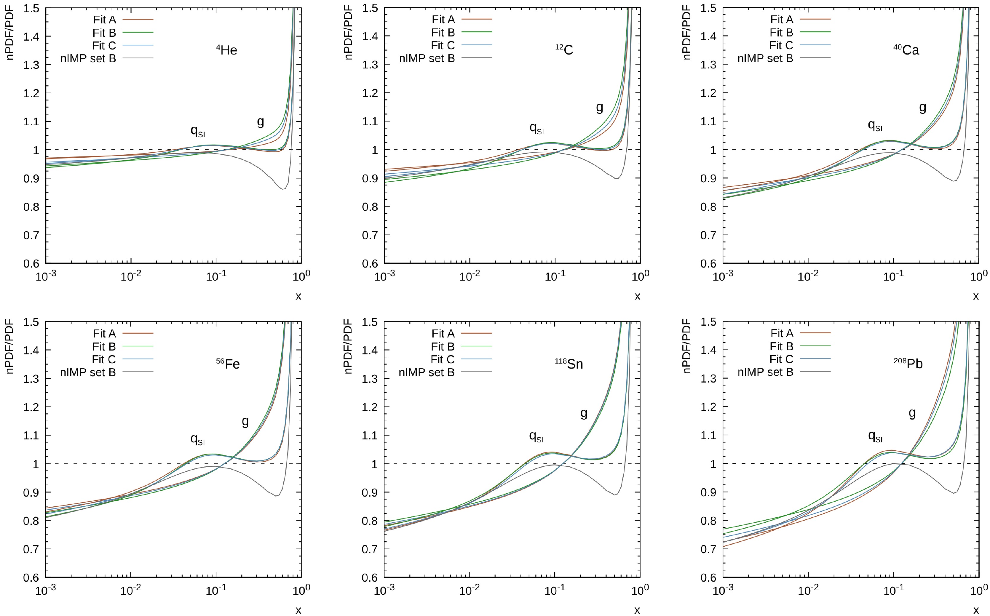 Figure 4. (color online) The predicted nuclear modification factors for parton distributions in several nuclear targets. The results for gluon nuclear modification predicted by the nIMP group [23] are shown for comparison.