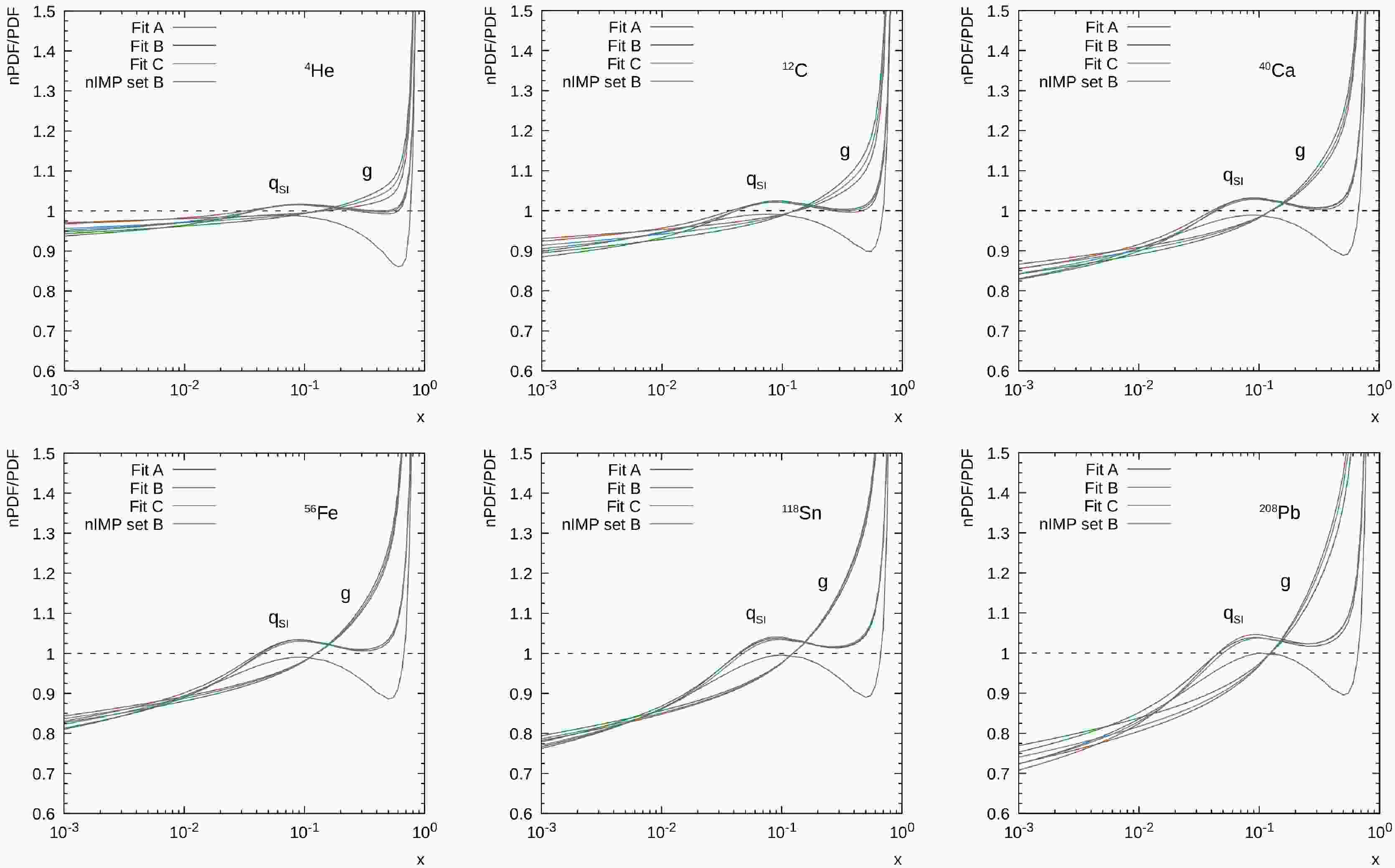 $ \delta^A_\pm $ and$ \delta^A_{NS} $ or rather their A-dependence, one can obtain predictions for the nuclear modification of parton distributions. Our results are shown in Fig. 4 for several light and heavy nuclei. As is well known, nuclear modification is weakly dependent on$ Q^2 $ at low and moderate$ Q^2 $ ; therefore, we show only the results for$ Q^2 = 10 $ GeV2. For comparison, we also plot the results for gluon nuclear modification factors predicted by the nIMP group [23]. We find that the shadowing effect for gluons is, in general, weaker than for quarks, which is consistent with the results of other studies (see, for example, [23, 24, 37, 38]). Here, similar to structure function ratios, Fit A and Fit C predict slightly stronger (weaker) shadowing effects for heavy (light) nuclei compared to Fit B (see Fig. 1). Nevertheless, the difference between these results is rather small, and the predicted shadowing effects are close to the nIMP expectations. This is in contrast to the observations in the large-x region, where we find a significant discrepancy with the nIMP calculations. In fact, the latter demonstrate a very weak antishadowing at$ x \sim 0.1 $ , while our calculations indicate significant antishadowing effects for quarks. Note that a very large antishadowing of nuclear gluon densities is predicted by other groups [24, 38]. Thus, at present, it is difficult to draw any specific inference. We can conclude again that precision measurements at future colliders (EiC, EiCC) are needed to clarify this point. We hope that this analysis may simplify future comparisons between the experimental data and theory and could be helpful in distinguishing different approaches.