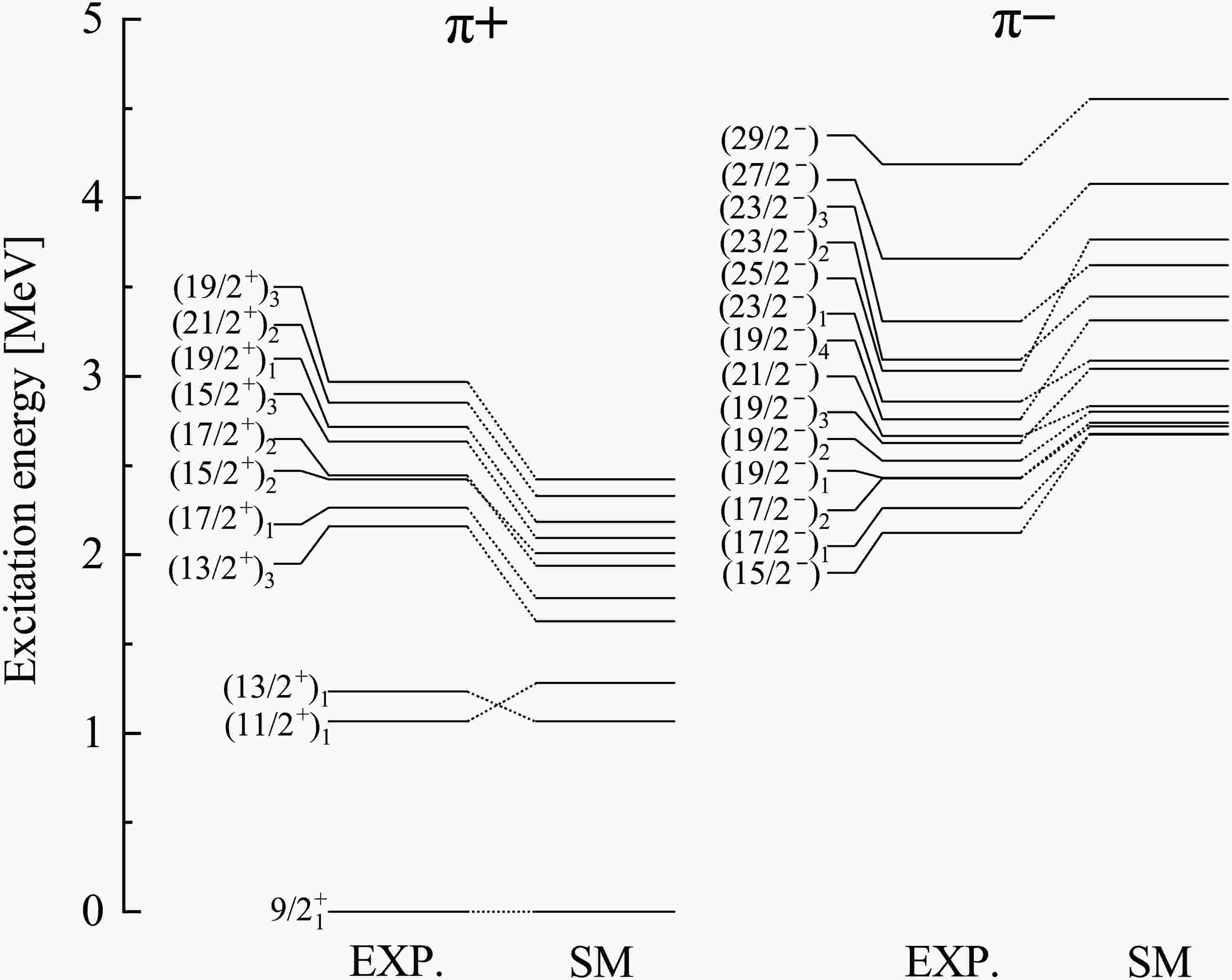 $ ^{117} {\rm{In}}$ using the NUSHELLX code within the SNE model space [45]. The adopted two-body matrix elements are named SNET in the code [45]. The SNE model space includes eight proton orbitals ($ \pi 1f_{5/2} $ ,$ \pi 2p_{3/2} $ ,$ \pi 2p_{1/2} $ ,$ \pi 1g_{9/2} $ ,$ \pi 1g_{7/2} $ ,$ \pi 2d_{5/2} $ ,$ \pi 2d_{3/2} $ , and$ \pi 3s_{1/2} $ ) and nine neutron orbitals ($ \nu 1f_{5/2} $ ,$ \nu 2p_{3/2} $ ,$ \nu 2p_{1/2} $ ,$ \nu 1g_{9/2} $ ,$ \nu 1g_{7/2} $ ,$ \nu 2d_{5/2} $ ,$ \nu 2d_{3/2} $ ,$ \nu 3s_{1/2} $ , and$ \nu 1h_{11/2} $ ). To make the calculation feasible, the following truncation was used. The$ \pi 1f_{5/2} $ ,$ \pi 2p_{3/2} $ , and$ \pi 2p_{1/2} $ orbitals and$ \nu 1f_{5/2} $ ,$ \nu 2p_{3/2} $ ,$ \nu 2p_{1/2} $ , and$ \nu 1g_{9/2} $ orbitals were kept fully occupied. The$ \pi 1g_{9/2} $ orbital was occupied by nine protons. At least six neutrons were constrained on the$ \nu 1g_{7/2} $ orbital and four neutrons were constrained on the$ \nu 2d_{5/2} $ orbital. No restrictions were applied to the$ \nu 2d_{3/2} $ and$ \nu 3s_{1/2} $ orbitals. A maximum of two neutrons were permitted in the$ \nu 1h_{11/2} $ orbital.A comparison of the calculated results with the experimental level energies is shown in Fig. 5. As shown in Fig. 5, the calculated excitation energies are in rough agreement with the experimental values. Table 2 displays the experimental and calculated level energies, as well as dominant configurations of the states in structure B. For the positive-parity states, the 9/21+ ground state is attributed to the valance proton occupying the