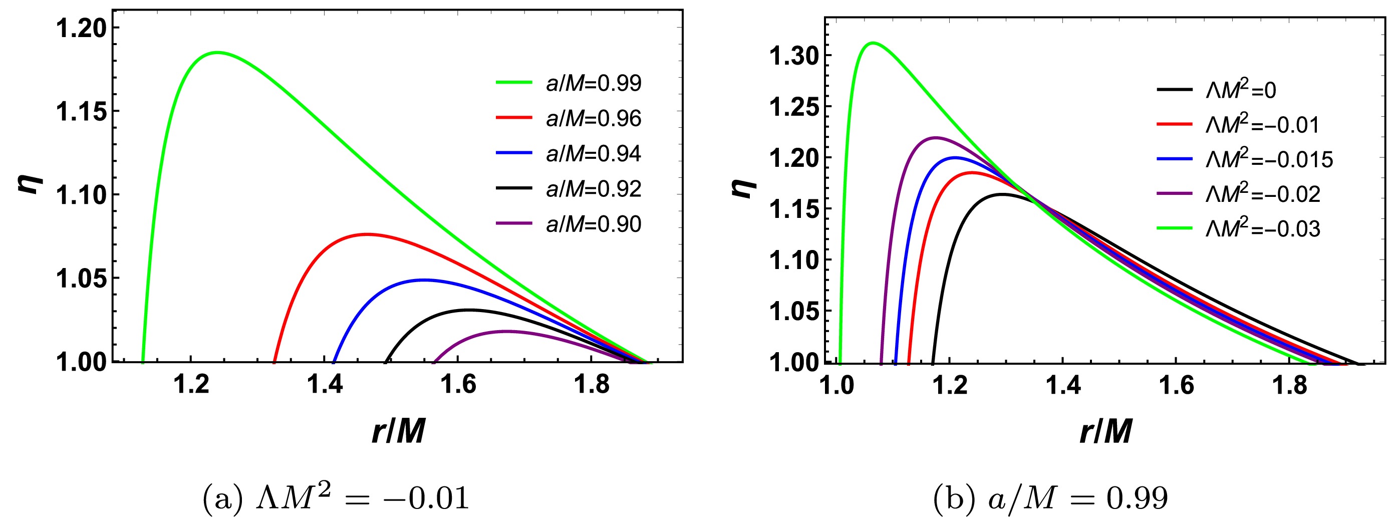 $ r/M $ by taking$ \sigma_0=100 $ ,$ \xi=\dfrac{\pi}{12} $ , and$ \Lambda M^2=-0.01 $ with different values of spin$ a/M $ . Spin$ a/M $ = 0.99, 0.96, 0.94, 0.92, and 0.90 from top to bottom. (b) The behaviors of η as a function of the dominant reconnection radial location$ r/M $ by taking$ \sigma_0=100 $ ,$ \xi=\dfrac{\pi}{12} $ , and$ a/M=0.99 $ with different values of the cosmological constant$ \Lambda M^2 $ . Cosmological constant$ \Lambda M^2 $ = -0.03, -0.02, -0.015, -0.01, and 0 from top to bottom.Examining Fig. 7(b) with
