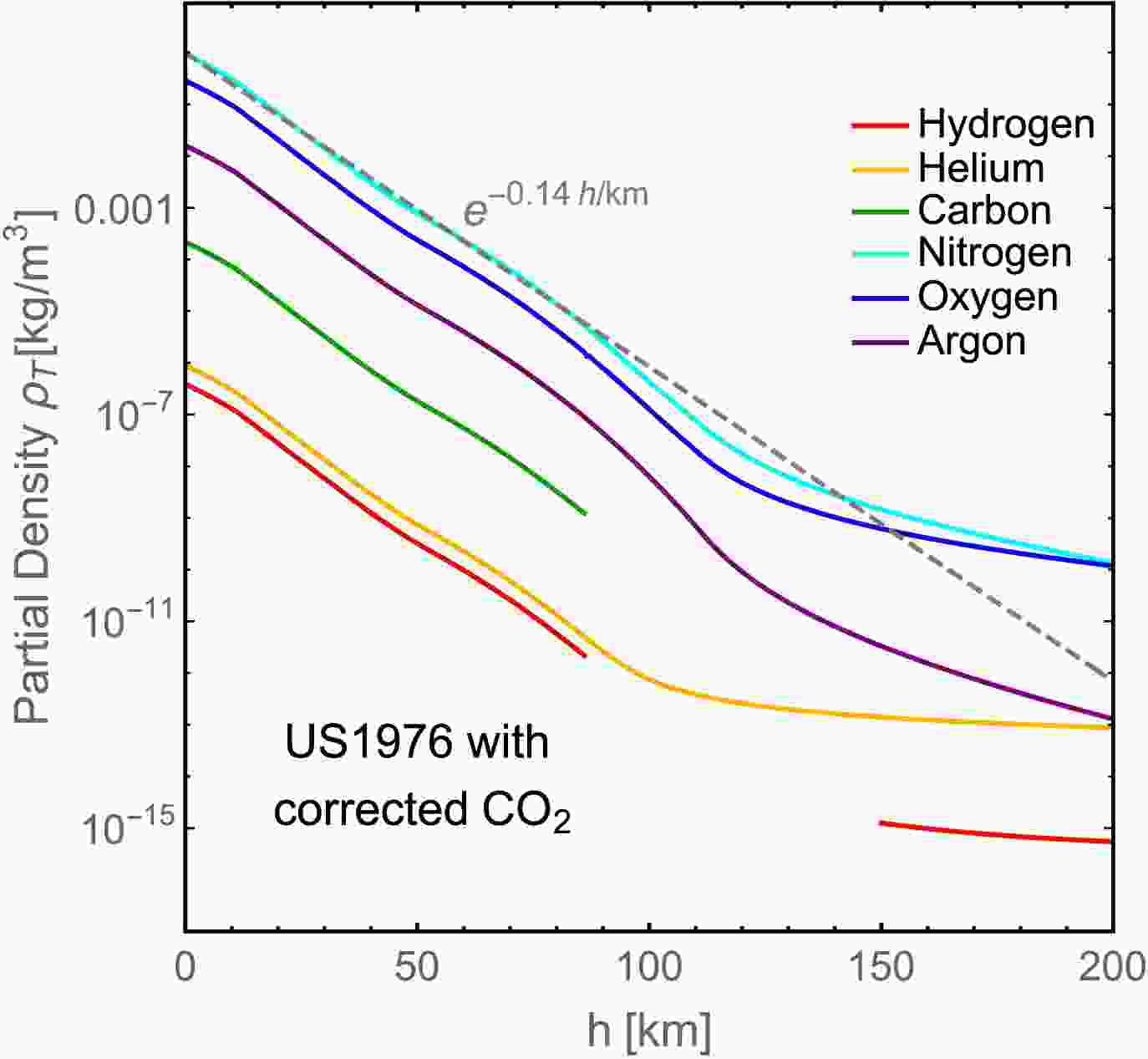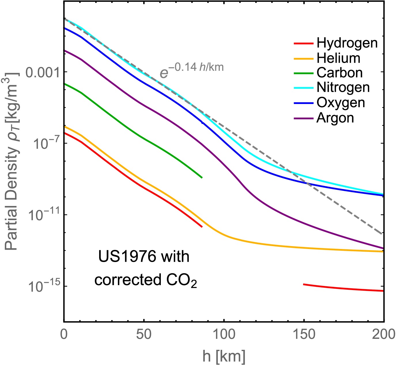 Figure 2 shows the partial densities of the updated US Standard Atmosphere 1976. Below 86 km the atmosphere is taken to be homogeneously mixed, so the relative abundances of nitrogen, oxygen, argon, carbon, helium and hydrogen are constant. Throughout this region each component follows an exponential profile,