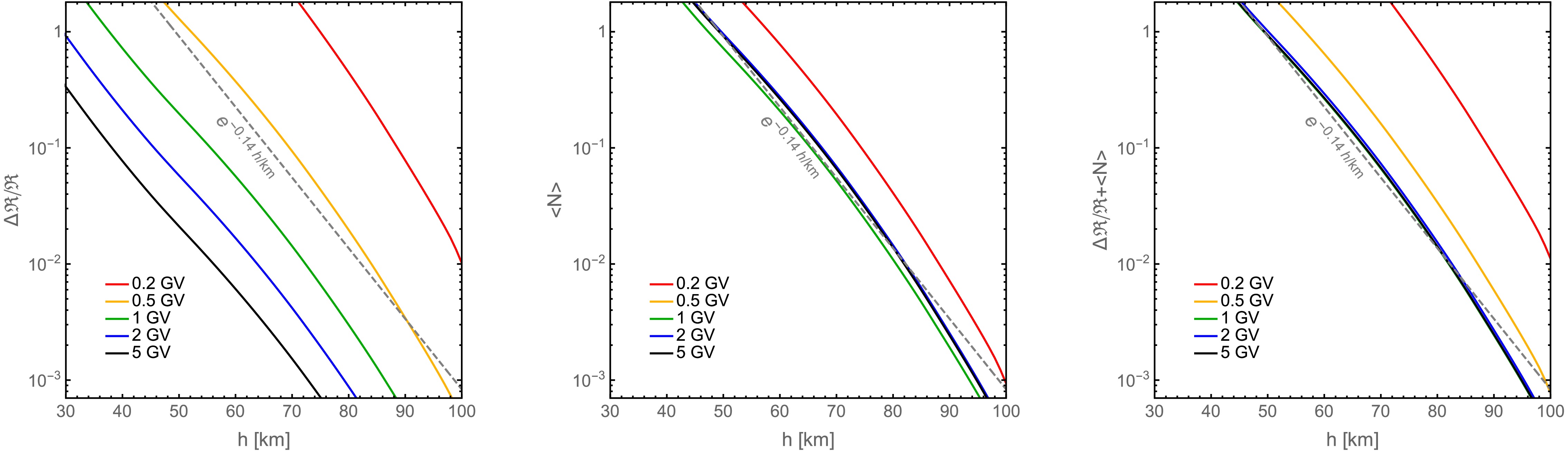 $ \Delta\mathfrak{R}/\mathfrak{R}+\langle N\rangle $ versus rigidity for five cosmic-ray species on a straight-line trajectory tangent to the atmosphere at$ h=50 $ km. Bethe-Bloch energy loss, scaling approximately as$ \beta^{-2} $ , dominates at low rigidities, while hard scattering, with its nearly energy-independent cross section, takes over at high rigidities. The crossover occurs at$ \sim0.57 $ GV for protons and rises to$ \sim1.4 $ GV for iron. These reference values are inserted into Eq. 13 to obtain the full altitude- and curvature-corrected estimates. Again, values$ \Delta\mathfrak{R}/\mathfrak{R}\gtrsim1 $ obtained from the perturbative calculation are simply rescaled by Eq. 13 to the region$ \Delta\mathfrak{R}/\mathfrak{R}\ll1 $ .