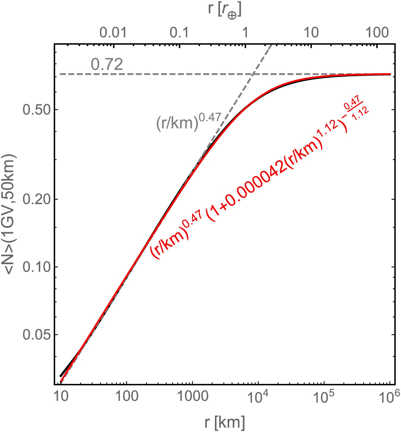 $ \langle N \rangle $ versus local radius of curvature r for an upward-bent trajectory with perigee altitude 50 km. The black curve gives the full calculation; grey dashed curves show the low-r fit and high-r asymptote; the red curve is the global fit.$ g(r)=\left(\frac{r}{ {\rm{km}}}\right)^{0.47}\; \left(1+0.000042\left(\frac{r}{ {\rm{km}}}\right)^{1.12}\right)^{-\frac{0.47}{1.12}}, $