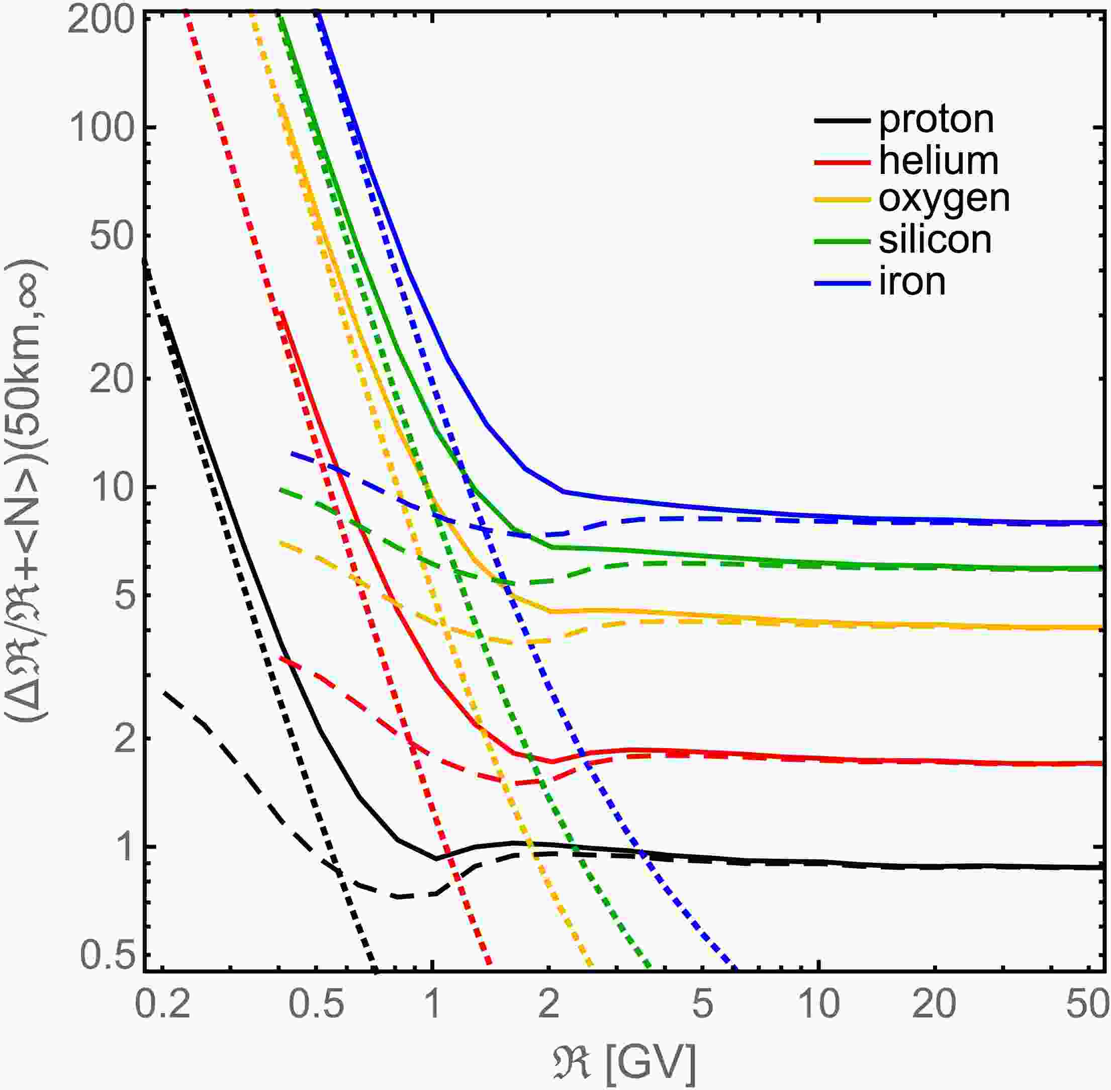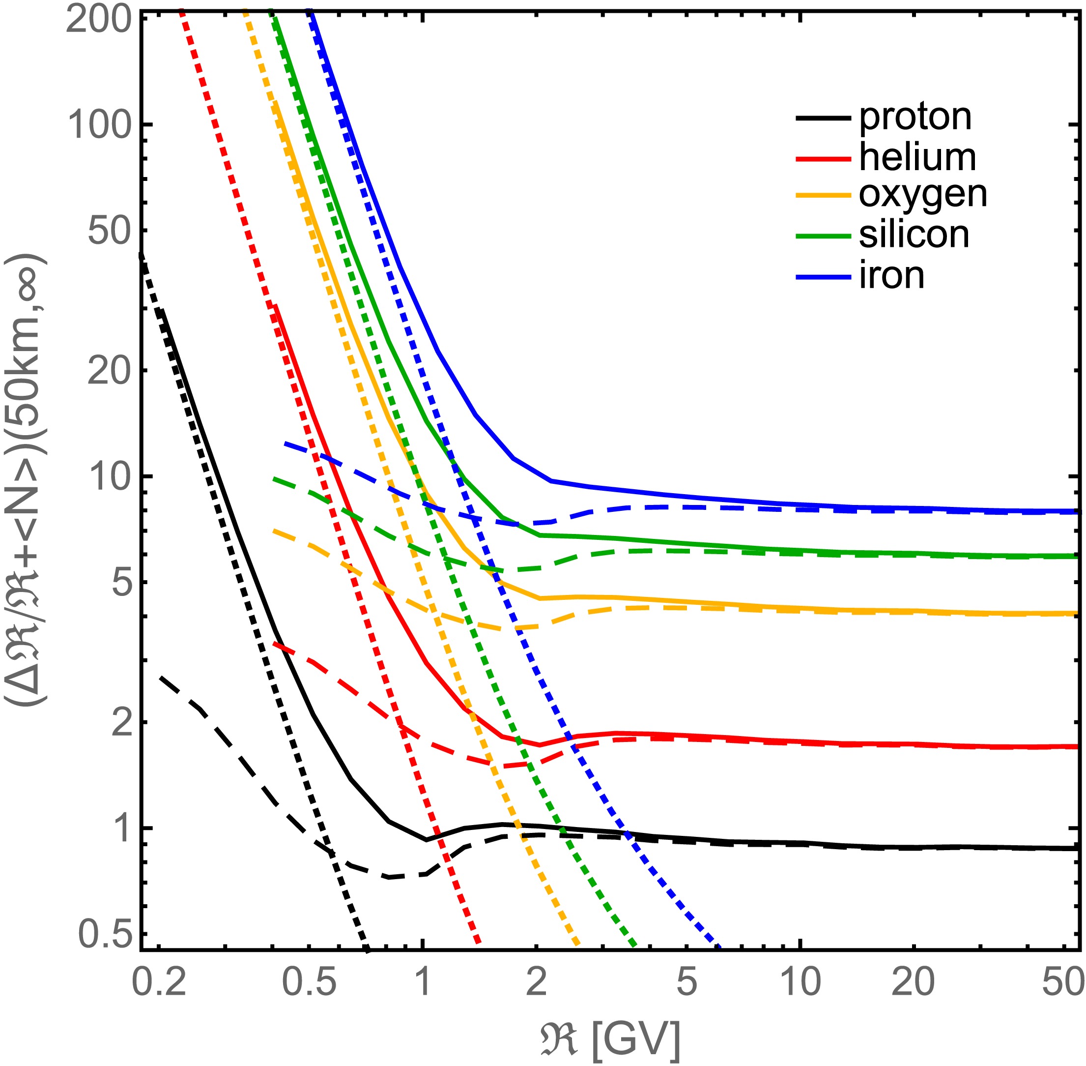 $ \Delta\mathfrak{R}/\mathfrak{R} $ (dotted), expected hard-scattering count$ \langle N \rangle $ (dashed) and their sum (solid) versus incident rigidity for five elements-proton (black), helium (red), oxygen (orange), silicon (green) and iron (blue)-in a straight-line trajectory with perigee altitude 50 km.For protons at 50 km,