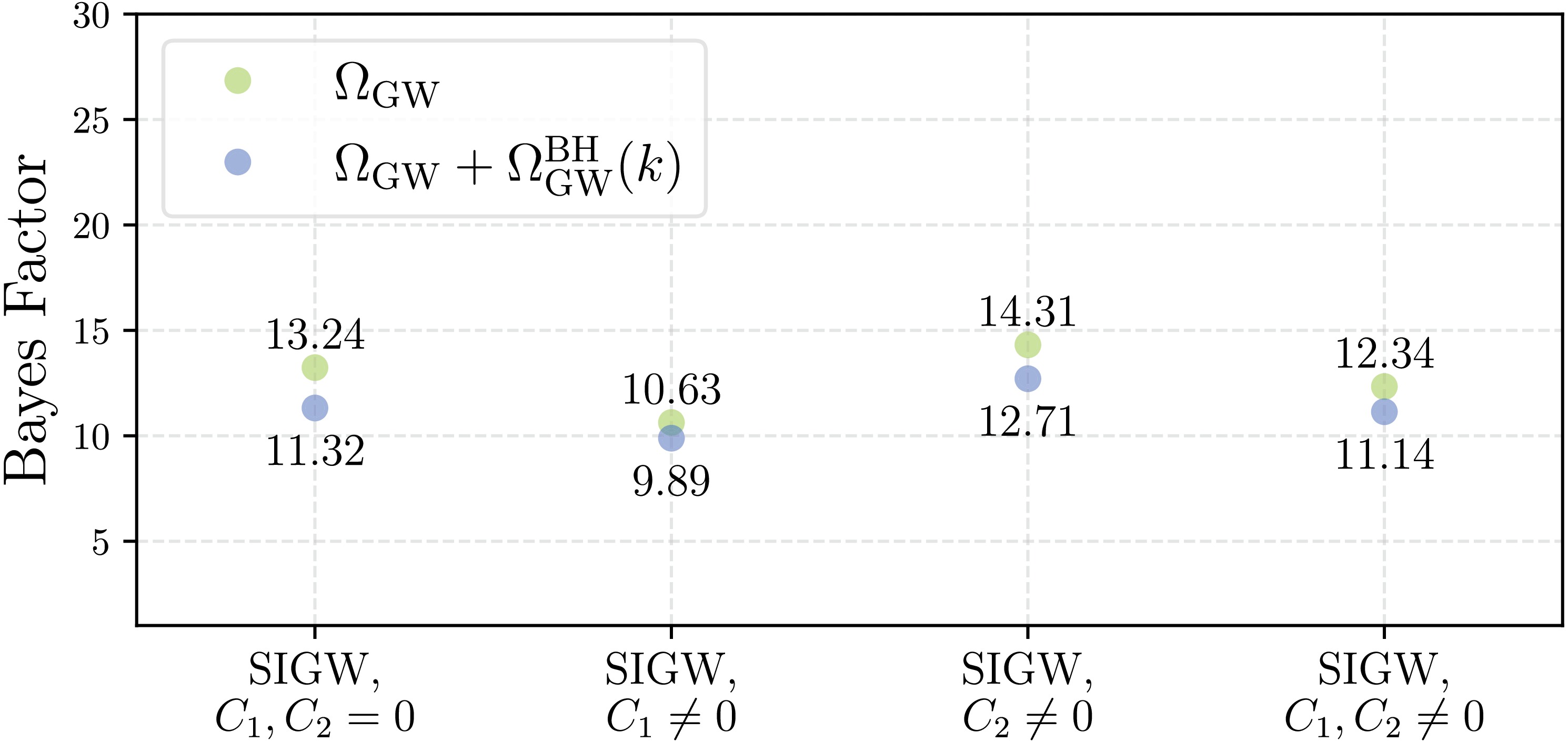 Figure 10. (color online) The Bayes factors between different models. The vertical axis represents the Bayes factor of different models relative to SMBHB, and the horizontal axis represents the different models. The green dots are for models without SMBHB and the blue dots are for models in combination with the SMBHB signal.