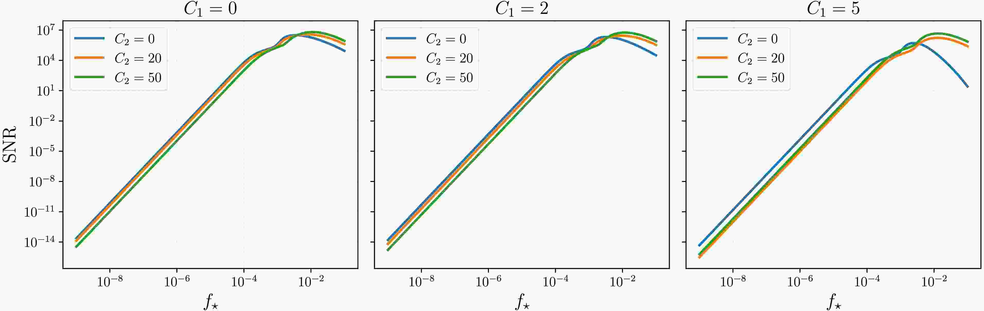 $ A_{\zeta} $ , σ, and$ f_* $ of the isotropic primordial power spectrum$ {\cal{P}}_{0,\zeta} $ can be constrained relatively effectively. However, the anisotropy parameters$ C_1 $ and$ C_2 $ remain unconstrained. In this analysis, we fix the isotropic parameters of$ {\cal{P}}_{0,\zeta} $ to the median values determined by PTA observations in Fig. 5, and vary the anisotropy parameters$ C_1 $ and$ C_2 $ to examine their impact on SGWB observations in the LISA frequency band. More precisely, in order to explore the impact of anisotropic primordial power spectrum on the second-order SIGWs, we calculate the SNR ρ for LISA [68, 69]$ \rho = \sqrt{T}\left[ \int {\rm{d}} f\left(\frac{\bar{\Omega}_{{\rm{GW}},0}(f)}{\Omega_{\rm{n}}(f)}\right)^2\right]^{1/2} \ , $