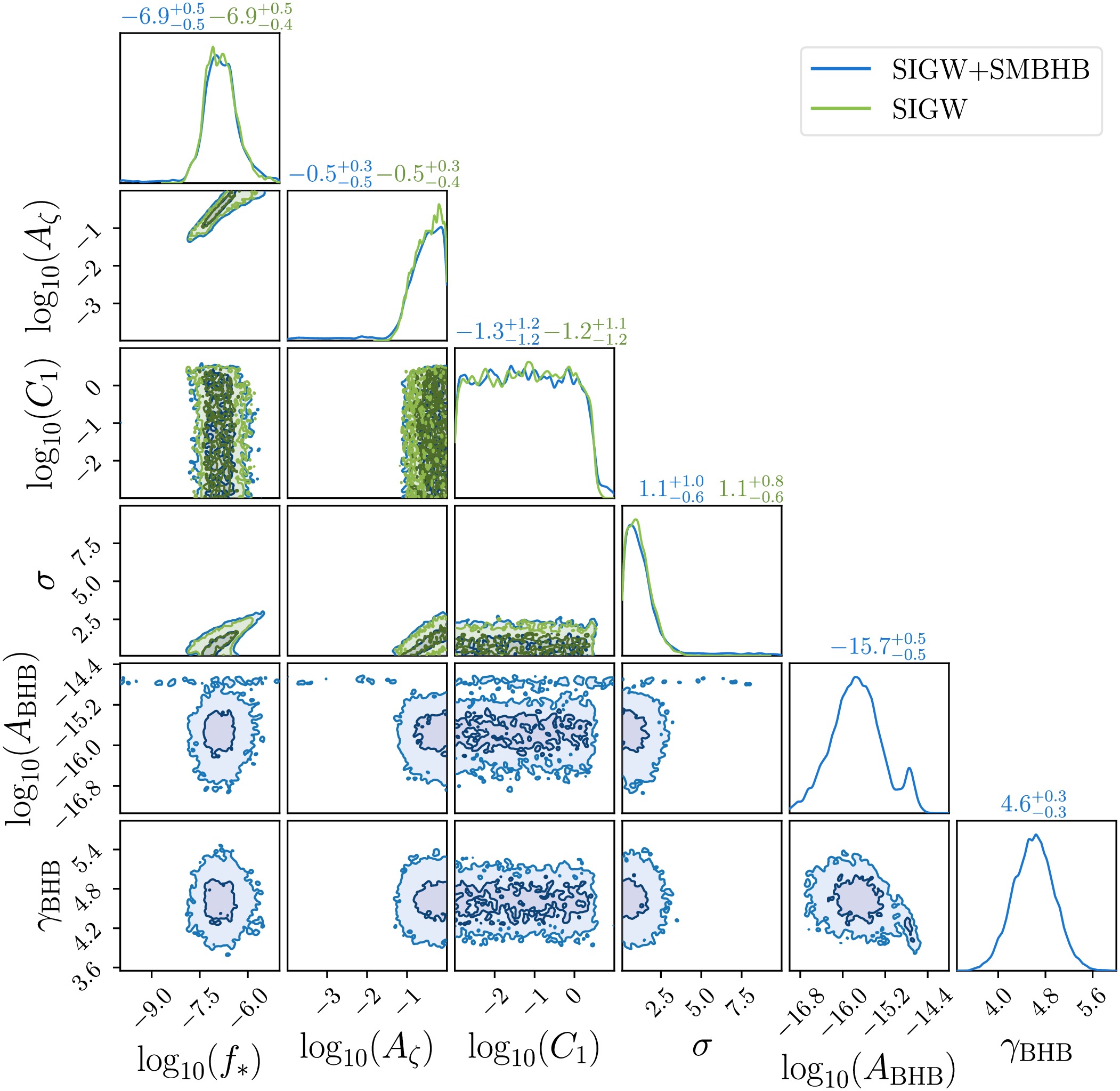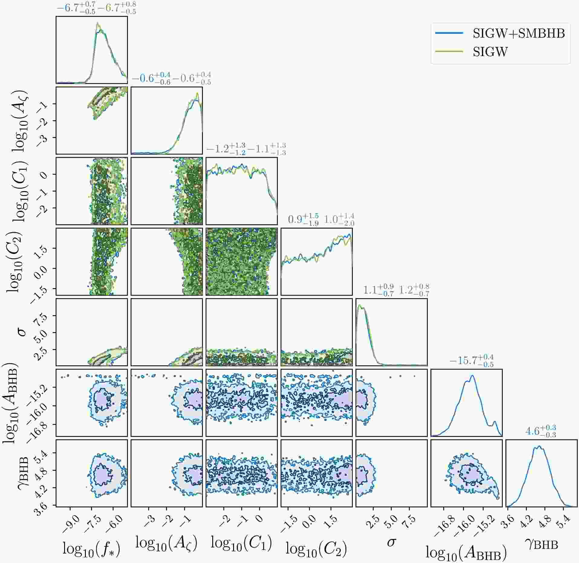 $ C_1 \neq 0 $ . The blue and green curves correspond to the NANOGrav 15-year dataset. Off-diagonal panels display 1-σ and 2-σ confidence intervals for joint distributions, while diagonal panels provide marginal distributions with median values and 1-σ uncertainties noted above each histogram.