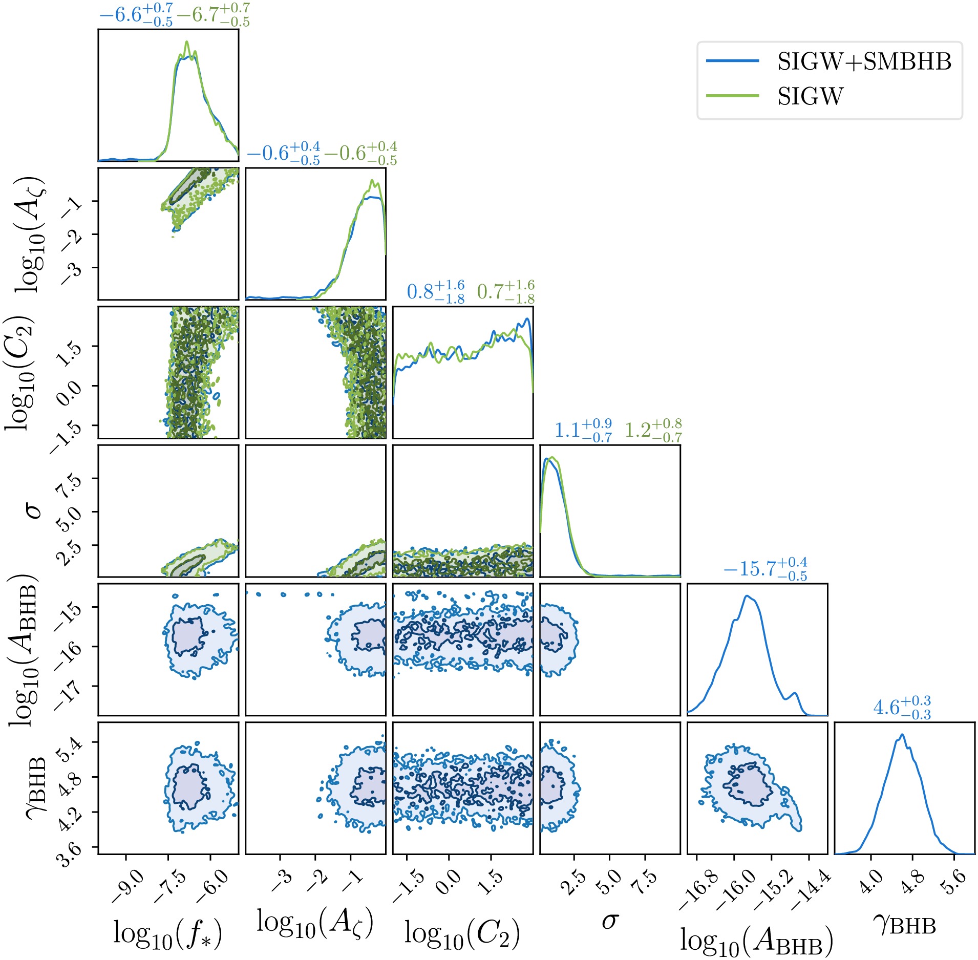 $ C_2 \neq 0 $ . The blue and green curves correspond to the NANOGrav 15-year dataset. Off-diagonal panels display 1-σ and 2-σ confidence intervals for joint distributions, while diagonal panels provide marginal distributions with median values and 1-σ uncertainties noted above each histogram.