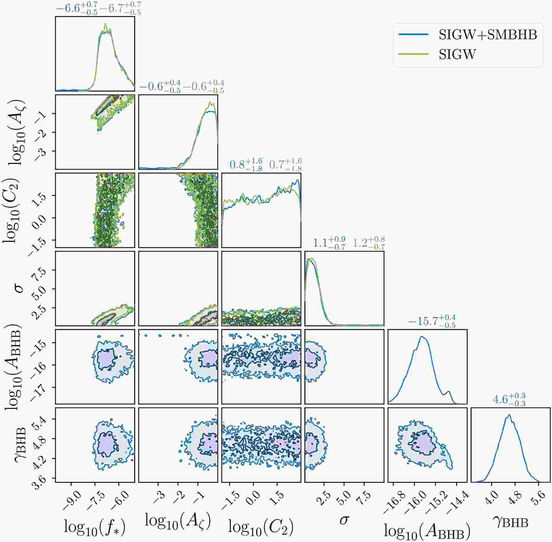 $ \log_{10}A_{{\rm{BHB}}} $ assumed to follow a multivariate Gaussian distribution [7]$ \begin{aligned} {\boldsymbol{\mu}}_{{\rm{BHB}}}&=\begin{pmatrix} -15.6 \\ 4.7 \end{pmatrix} \ , \\ {\boldsymbol{\sigma}}_{{\rm{BHB}}}&=0.1\times \begin{pmatrix} 2.8 & -0.026\\ -0.026 & 2.8 \end{pmatrix} \ . \end{aligned} $